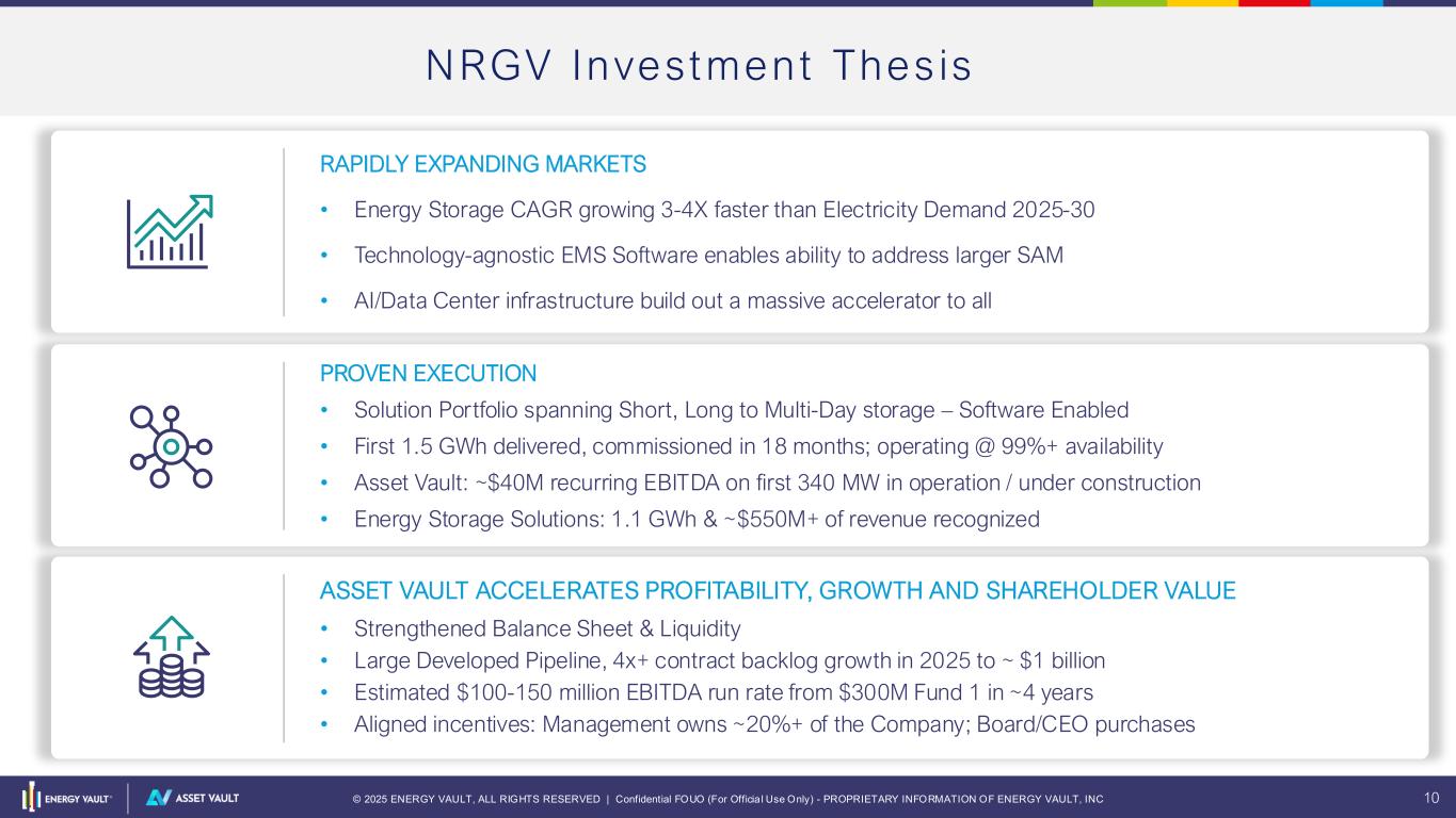 © 2025 ENERGY VAULT, ALL RIGHTS RESERVED | Confidential FOUO (For Officia l Use Only) - PROPRIETARY INFORMATION OF ENERGY VAULT, INC 9 With Asset Vaul t , Ene rgy Vaul t Becomes a Fu l ly Integrated IPP Energy Vault’s existing and future power and storage assets ENERGY VAULT HOLDINGS, INC. CASH FLOWS PUBLIC SHAREHOLDERS LONG TERM VALUE Asset ID & Development Self Integration EPCM Software LTSA Services FUNDING E N E R GY V A U LT ( N R G V ) S T R U CT U R E A N D V A L U E C R E AT I O N M O D E L Core Expertise: Proprietary Energy Storage Solutions (ESS) + Advanced Integration Know-How + EMS Software = ↑ Project IRR’s Asset Vault: Vehicle to finance and own energy infrastructure assets Funding Model: • Equity (Asset Vault) | Project Financing | Tax Credit • Cash returns to Energy Vault : o Post-Pref-Equity cash distributions o Integration Margin o LTSA (long-term service agreement) fees, and Financial Return: • ~1.5 GW assets, $100 -150M annual EBITDA, supported by the initial $300 million from OIC (Fund #1) C A P I T A L P R O V I D E R S FUND #1 FUND #2 FUND #3 ENERGY STORAGE SOLUTIONS (ESS) $ DevEx CapEx