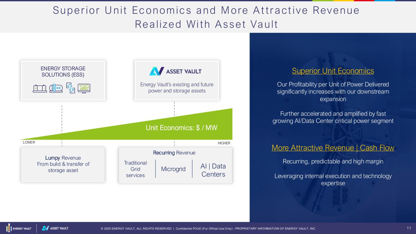 © 2025 ENERGY VAULT, ALL RIGHTS RESERVED | Confidential FOUO (For Officia l Use Only) - PROPRIETARY INFORMATION OF ENERGY VAULT, INC 10 Screenshot 2025-10-08 at 11.26.43 AM Screenshot 2025-10-08 at 11.26.43 AM Screenshot 2025-10-08 at 11.26.43 AM NRGV Investment Thes is PROVEN EXECUTION • Solution Portfolio spanning Short, Long to Multi-Day storage – Software Enabled • First 1.5 GWh deliver d, commissioned in 1 months; operating @ 99%+ availability • Asset Vault: ~$40M recurring EBITDA on first 340 MW in operation / under construction • Energy Storage Solutions: 1.1 GWh & ~$550M+ of revenue recognized ASSET VAULT ACCELERATES PROFITABILITY, GROWTH AND SHAREHOLDER VALUE • Strengthened Balance Sheet & Liquidity • Large Developed Pipeli e, 4x+ contract backlog growth in 2025 to ~ $1 billion • Estimated $100-150 million EBITDA run rate from $300M Fund 1 in ~4 years • Aligned incentives: Management owns ~20%+ of the Company; Board/CEO purchases RAPIDLY EXPANDING MARKETS • Energy Storage CAGR growing 3-4X faster than Electricity Demand 2025-30 • Technology-agnostic EMS Software enables ability to address larger SAM • AI/Data Center infrastructure build out a massive accelerator to all