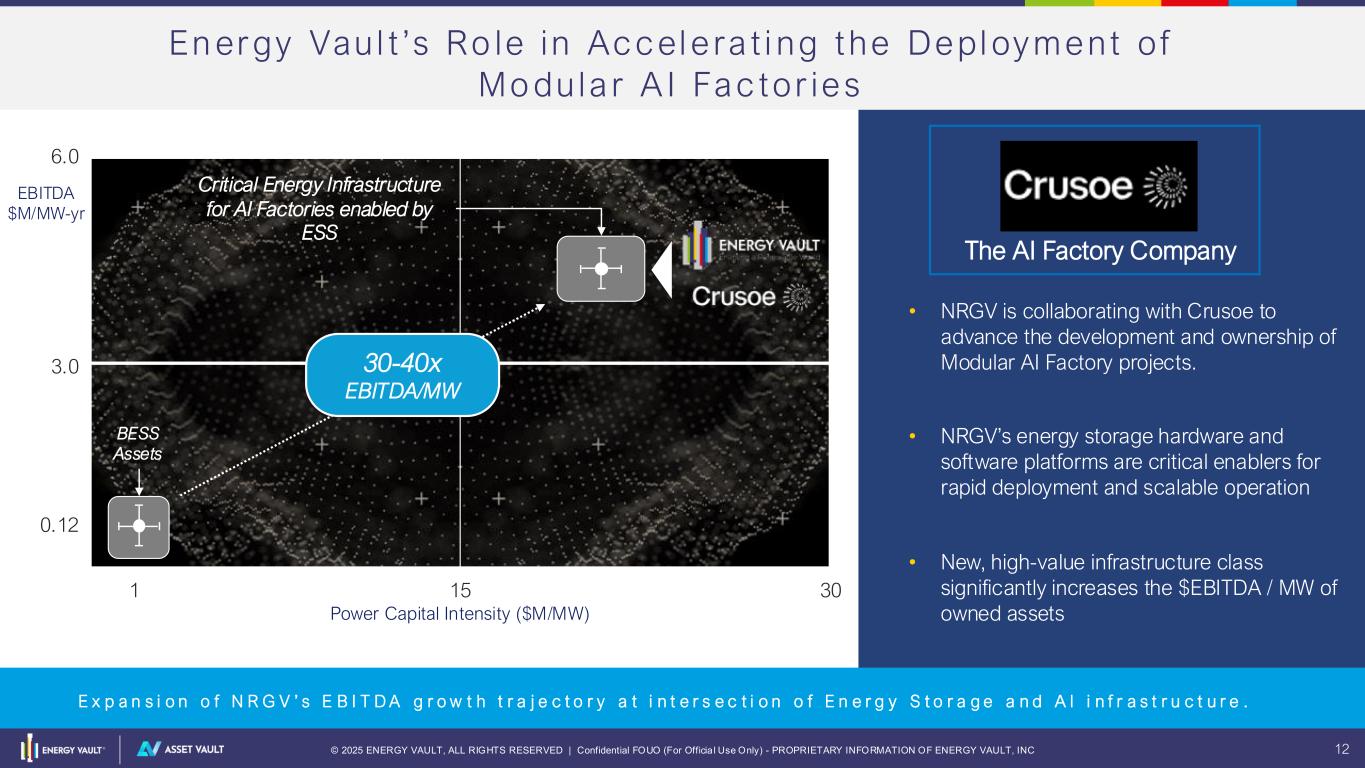 © 2025 ENERGY VAULT, ALL RIGHTS RESERVED | Confidential FOUO (For Officia l Use Only) - PROPRIETARY INFORMATION OF ENERGY VAULT, INC 11 Sup er io r U n i t Ec onomic s and M ore A t t r act ive Revenue Rea l i zed Wi th A sse t Vau l t Lumpy Revenue From build & transfer of storage asset Superior Unit Economics Our Profitability per Unit of Power Delivered significantly increases with our downstream expansion Further accelerated and amplified by fast growing AI/Data Center critical power segment More Attractive Revenue | Cash Flow Recurring, predictable and high margin Leveraging internal execution and technology expertise Energy Vault’s existing and future power and storage assets ENERGY STORAGE SOLUTIONS (ESS) Unit Economics: $ / MW LOWER HIGHER Recurring Revenue Traditional Grid services AI | Data Centers Microgrid