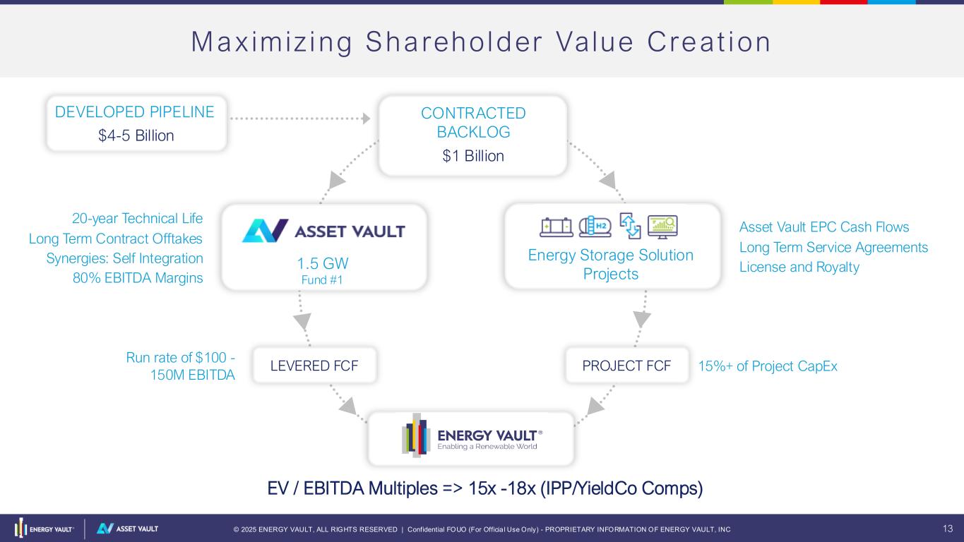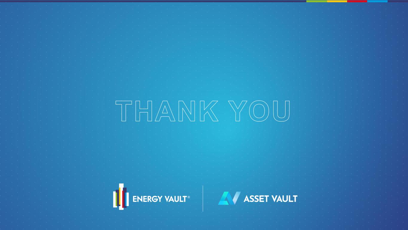 © 2025 ENERGY VAULT, ALL RIGHTS RESERVED | Confidential FOUO (For Officia l Use Only) - PROPRIETARY INFORMATION OF ENERGY VAULT, INC 12 15 30 3.0 6.0 1 0.12 En er gy Vau l t ’s Ro le in Ac c el e ra t i ng the Depl oyment o f Mo du la r A I Fac tor ies Power Capital Intensity ($M/MW) EBITDA $M/MW-yr BESS Assets Critical Energy Infrastructure for AI Factories enabled by ESS 30-40x EBITDA/MW • NRGV is collaborating with Crusoe to advance the development and ownership of Modular AI Factory projects. • NRGV’s energy storage hardware and software platforms are critical enablers for rapid deployment and scalable operation • New, high-value infrastructure class significantly increases the $EBITDA / MW of owned assets The AI Factory Company E x p a n s i o n o f N R G V ’ s E B I T D A g r o w t h t r a j e c t o r y a t i n t e r s e c t i o n o f E n e r g y S t o r a g e a n d A I i n f r a s t r u c t u r e .