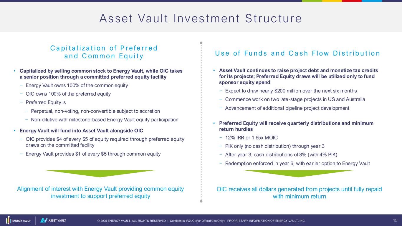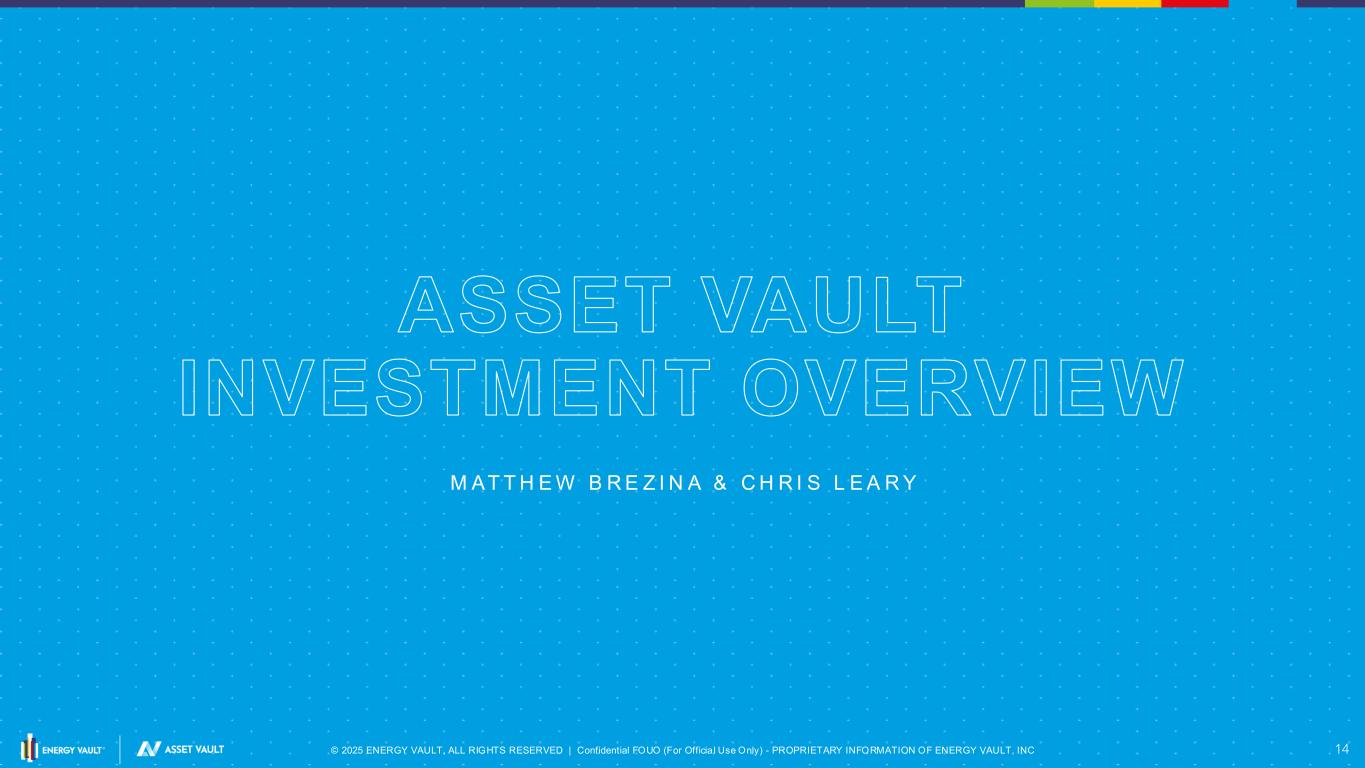© 2025 ENERGY VAULT, ALL RIGHTS RESERVED | Confidential FOUO (For Officia l Use Only) - PROPRIETARY INFORMATION OF ENERGY VAULT, INC 14 ASSET VAULT INVESTMENT OVERVIEW M AT T H E W B R E Z I N A & C H R I S L E A R Y