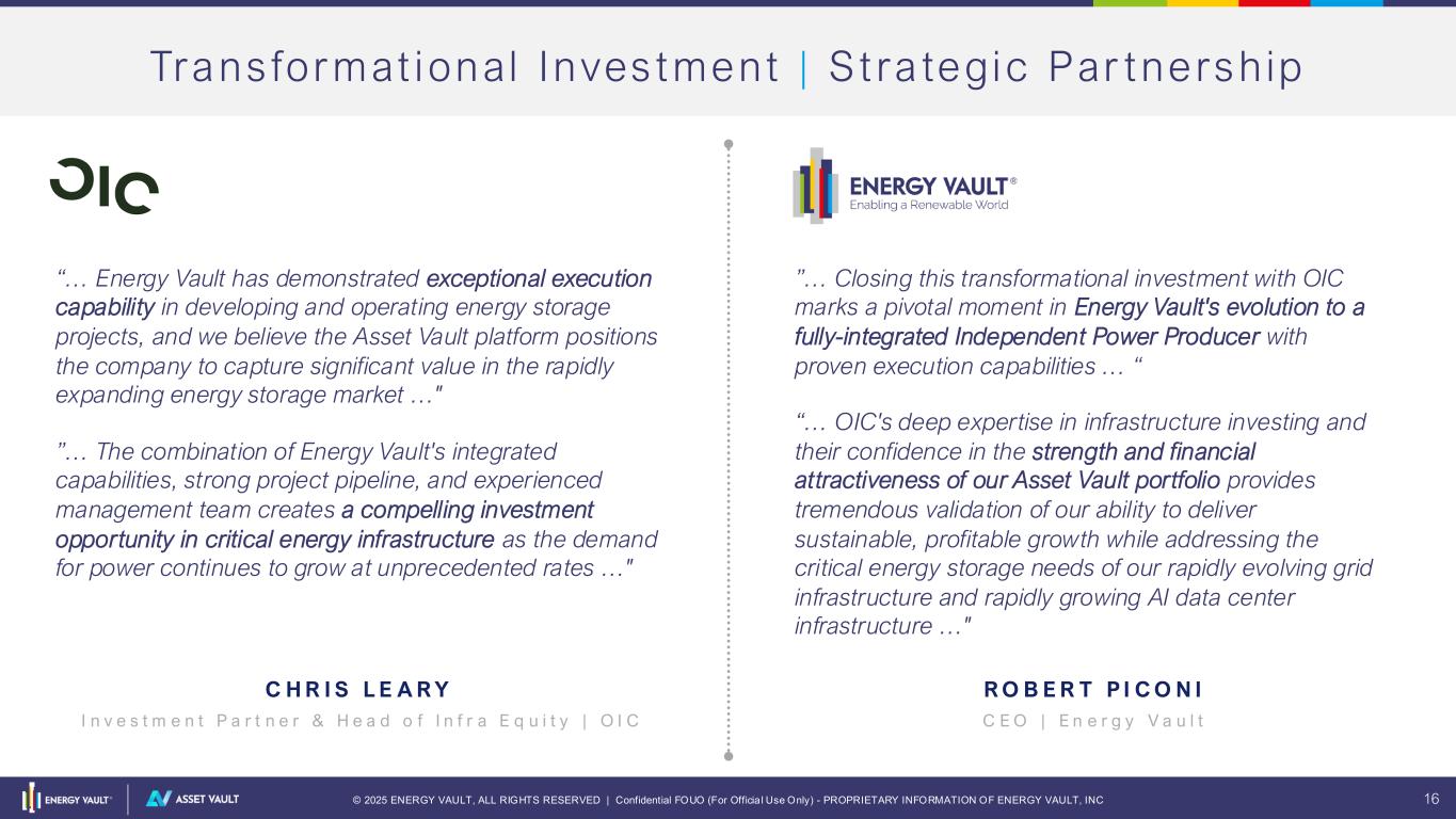 © 2025 ENERGY VAULT, ALL RIGHTS RESERVED | Confidential FOUO (For Officia l Use Only) - PROPRIETARY INFORMATION OF ENERGY VAULT, INC 15 Asset Vau l t Inves tment S t ruc ture C a p i t a l i z a t i o n o f P r e f e r r e d a n d C o m m o n E q u i t y U s e o f Fu n d s a n d C a s h F l o w D i s t r i b u t i o n • Capitalized by selling common stock to Energy Vault, while OIC takes a senior position through a committed preferred equity facility – Energy Vault owns 100% of the common equity – OIC owns 100% of the preferred equity – Preferred Equity is – Perpetual, non-voting, non-convertible subject to accretion – Non-dilutive with milestone-based Energy Vault equity participation • Energy Vault will fund into Asset Vault alongside OIC – OIC provides $4 of every $5 of equity required through preferred equity draws on the committed facility – Energy Vault provides $1 of every $5 through common equity • Asset Vault continues to raise project debt and monetize tax credits for its projects; Preferred Equity draws will be utilized only to fund sponsor equity spend – Expect to draw nearly $200 million over the next six months – Commence work on two late-stage projects in US and Australia – Advancement of additional pipeline project development • Preferred Equity will receive quarterly distributions and minimum return hurdles – 12% IRR or 1.65x MOIC – PIK only (no cash distribution) through year 3 – After year 3, cash distributions of 8% (with 4% PIK) – Redemption enforced in year 6, with earlier option to Energy Vault Alignment of interest with Energy Vault providing common equity investment to support preferred equity OIC receives all dollars generated from projects until fully repaid with minimum return
