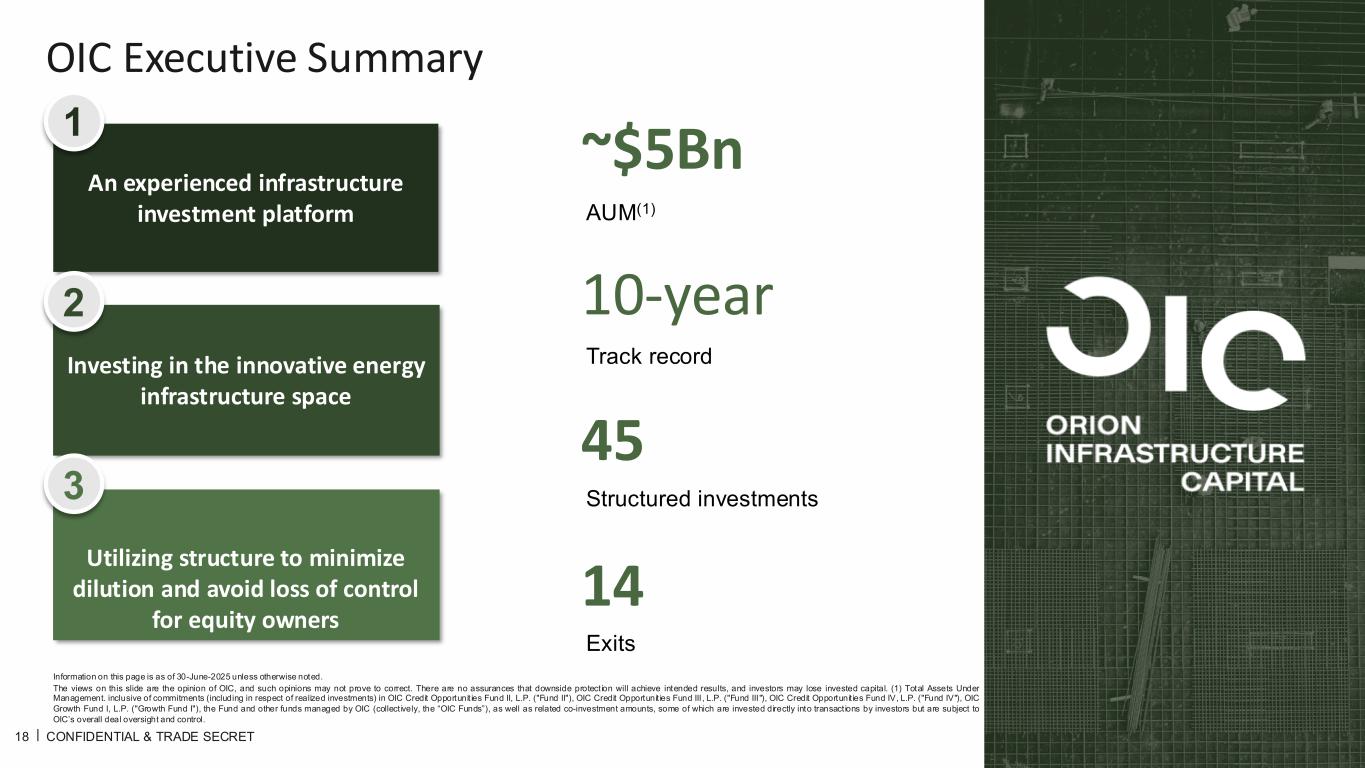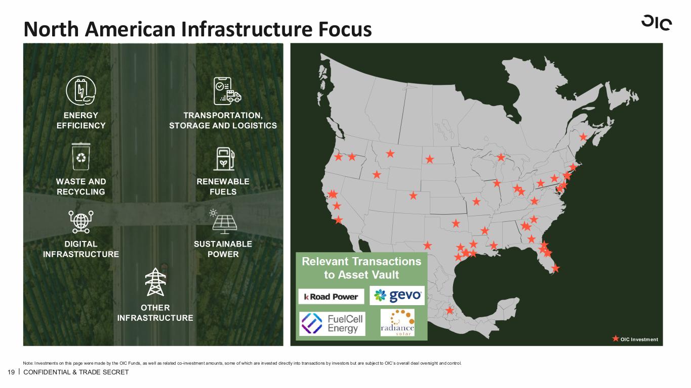 18 OIC Executive Summary CONFIDENTIAL & TRADE SECRET An experienced infrastructure investment platform Investing in the innovative energy infrastructure space Utilizing structure to minimize dilution and avoid loss of control for equity owners ~$5Bn AUM(1) 45 Structured investments 14 Exits 1 2 3 10-year Track record Information on this page is as of 30-June-2025 unless otherwise noted. The views on this slide are the opinion of OIC, and such opinions may not prove to correct. There are no assurances that downside protect ion will achieve intended results, and investors may lose invested capital. (1) Total Assets Under Management. inclusive of commitments (including in respect of realized investments) in OIC Credit Opportunit ies Fund II, L.P. ("Fund II"), OIC Credit Opportunit ies Fund III , L.P. ("Fund III "), OIC Credit Opportunit ies Fund IV, L.P. ("Fund IV"), OIC Growth Fund I, L.P. ("Growth Fund I"), the Fund and other funds managed by OIC (collect ively, the “OIC Funds”), as well as related co-investment amounts, some of which are invested directly into transactions by investors but are subject to OIC’s overall deal oversight and control.