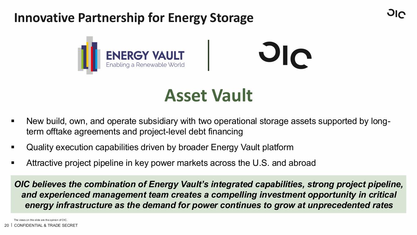 20 The views on this slide are the opinion of OIC. Innovative Partnership for Energy Storage OIC Investment Asset Vault ▪ New build, own, and operate subsidiary with two operational storage assets supported by long- term offtake agreements and project-level debt financing ▪ Quality execution capabilities driven by broader Energy Vault platform ▪ Attractive project pipeline in key power markets across the U.S. and abroad OIC believes the combination of Energy Vault’s integrated capabilities, strong project pipeline, and experienced management team creates a compelling investment opportunity in critical energy infrastructure as the demand for power continues to grow at unprecedented rat CONFIDENTIAL & TRADE SECRET
