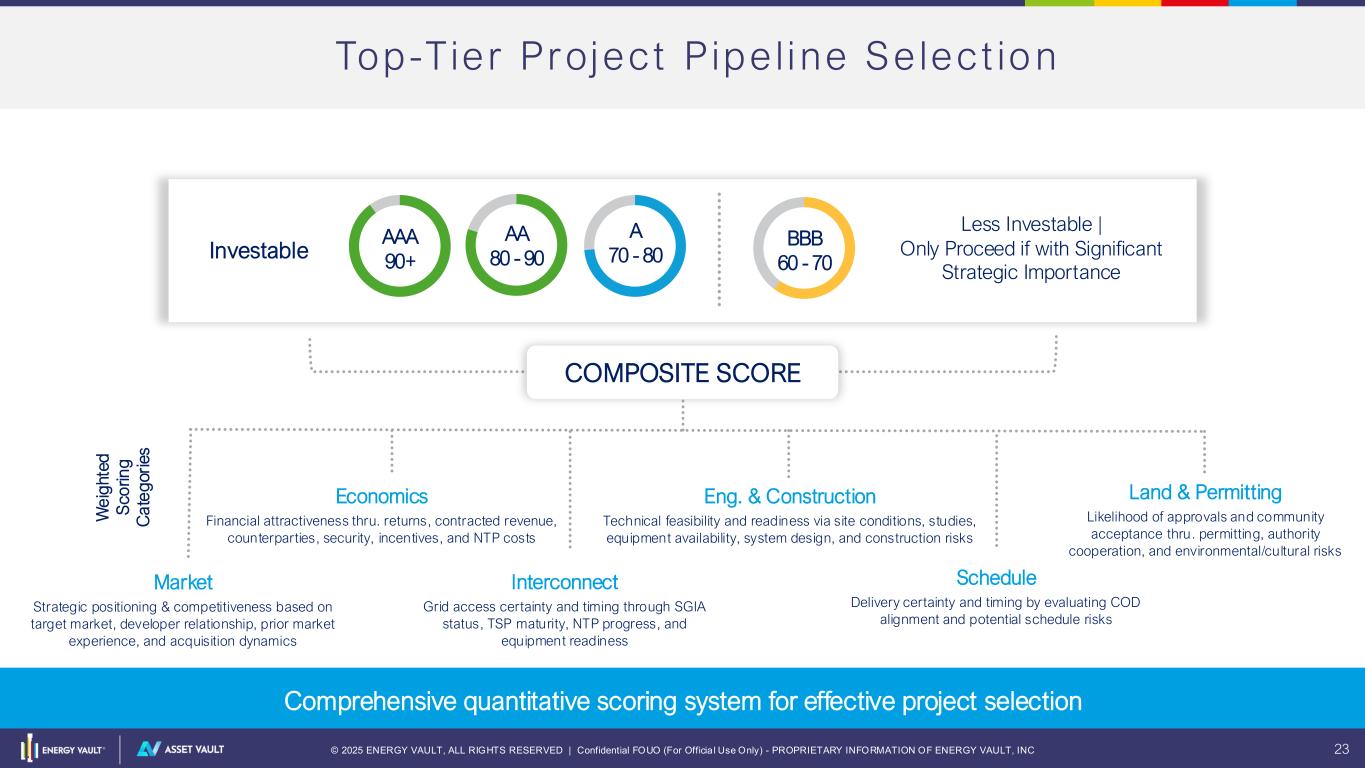 © 2025 ENERGY VAULT, ALL RIGHTS RESERVED | Confidential FOUO (For Officia l Use Only) - PROPRIETARY INFORMATION OF ENERGY VAULT, INC 22 Top -Tie r Pro jec t P i pe l i ne S el ect ion D i s c i p l i n e d i n v e s t m e n t f u n n e l l e a d i n g t o s e l e c t i o n o f o p t i m a l p r o j e c t s D E V E L O P E R R E P U T A T I O N • Only partner with / transact with developers that have a strong track record of commercial success and development expertise • Consider capability to originate future attractive projects P R O J E C T E C O N O M I C S • Only target IRRs that fall within Energy Vault’s criteria • Stress test with sensitivity cases in evaluation of projects for funding to ensure meeting of minimum returns P R O J E C T R I S K • Only target projects that have significantly advanced or clear line of sight to site control, permitting, interconnection and offtake • Probability weighting based on stage of maturity / perceived remaining risks P R O J E C T G E O G R A P H Y • Target diversity of project geographies with focus on markets with significant energy arbitrage opportunity P R O J E C T S C R E E N IN G C R IT E R IA D E V E L O P E R R E P U T A T I O N P R O J E C T E C O N O M I C S P R O J E C T R I S K P R O J E C T G E O G R A P H Y