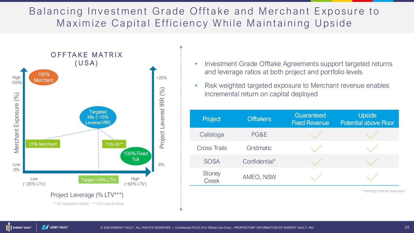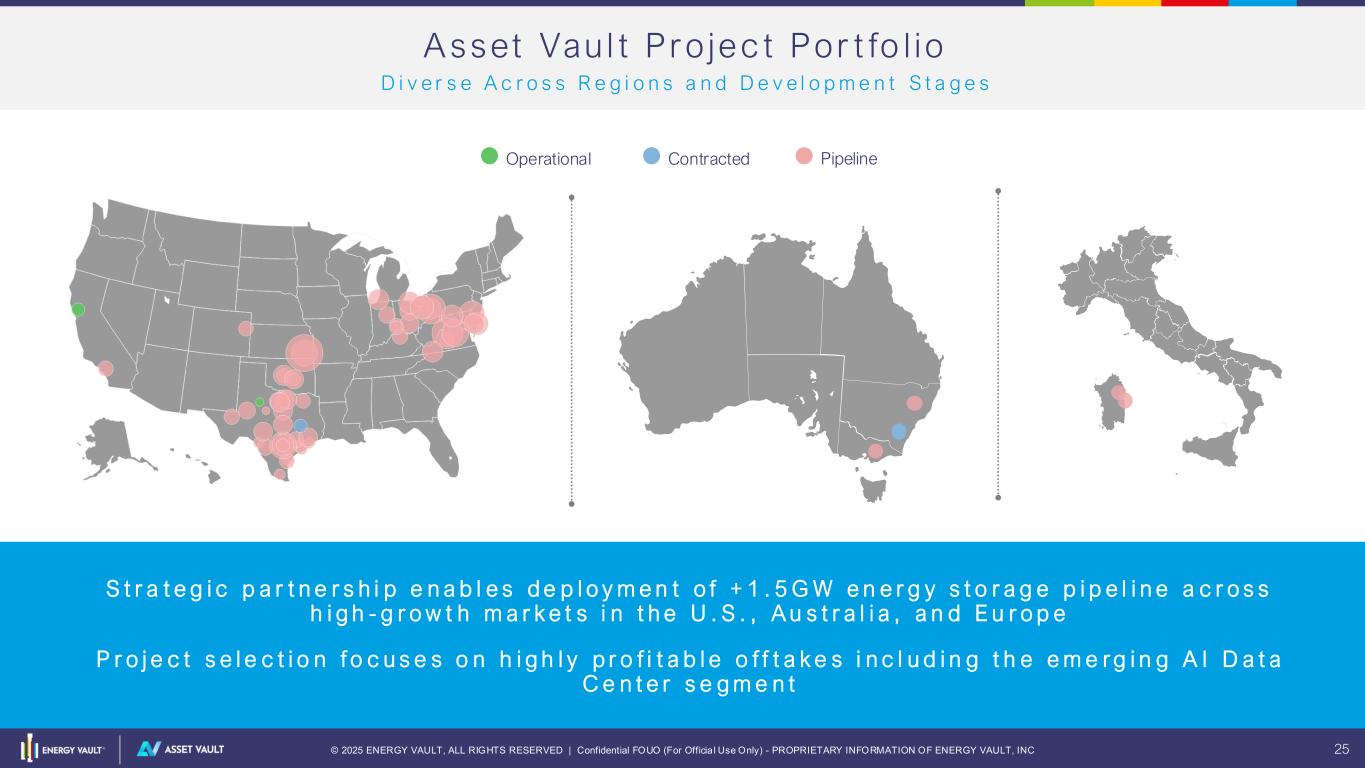 © 2025 ENERGY VAULT, ALL RIGHTS RESERVED | Confidential FOUO (For Officia l Use Only) - PROPRIETARY INFORMATION OF ENERGY VAULT, INC 24 Project Offtakers Guaranteed Fixed Revenue Upside Potential above Floor Calistoga PG&E Cross Trails Gridmatic SOSA Confidential* Stoney Creek AMEO, NSW B a lan c in g In v e st men t Gr ade O f f t a ke an d M er ch an t E xp o su r e to M ax im ize Ca p i ta l E f f i c ien c y W hi le M a in ta i n i ng U ps ide Low (~20% LTV) Project Leverage (% LTV***) High (~60% LTV) Low 0% High 100% Targeted Mix (~15% Levered IRR) O F F TA K E M A T R I X ( U S A ) • Investment Grade Offtake Agreements support targeted returns and leverage ratios at both project and portfolio levels • Risk weighted targeted exposure to Merchant revenue enables incremental return on capital deployed * Pending contract execution 25% Merchant 75% IG** 100% Merchant 100% Fixed Toll +20% 8% Target(~45% LTV) ** IG: Investment Grade; *** LTV: Loan to Value