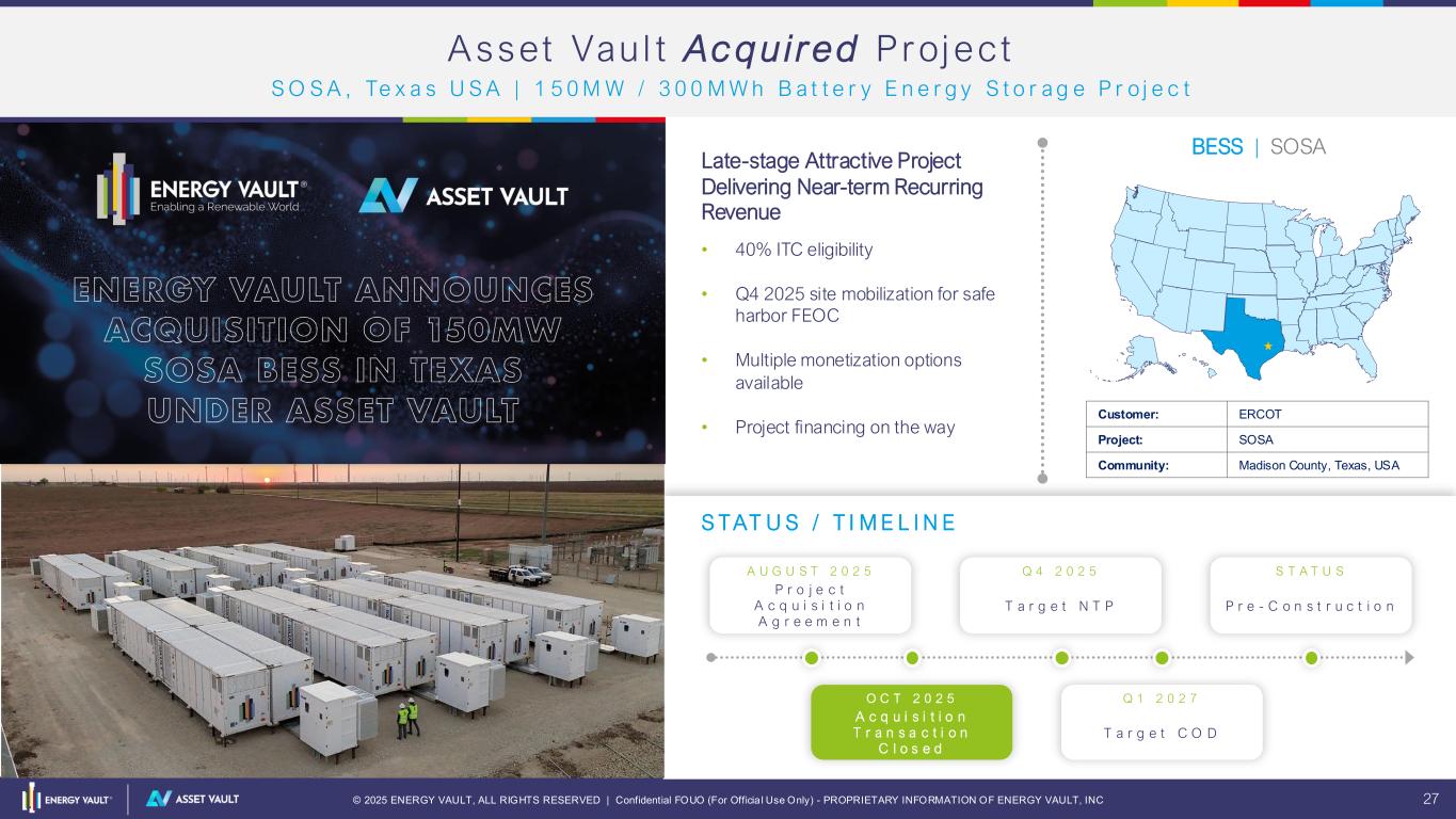 © 2025 ENERGY VAULT, ALL RIGHTS RESERVED | Confidential FOUO (For Officia l Use Only) - PROPRIETARY INFORMATION OF ENERGY VAULT, INC 26 In i t i a l +1 .5GW Energy Storage Asset Bu i ld Out $300M $75M 1. Assuming 75%/25% fund split between US and Non-US projects 2. US project capital stack: project debt (40%); ITC (35%); Equity (25%) 3. Non-US project capital stack: project debt (60%), Equity (40%) 4. Assuming average of $320/KWh cost throughout the build out period for full EPC Turnkey solution in US 5. Assuming average of $220/KWh cost throughout the build out period for full EPC Turnkey solution outside of US 6. Assuming average of 2.5-hour duration across US projects 7. Assuming average of 4-hour duration across non-US projects Asset Vault Equity CapEx Enabled Energy Capacity Power Capacity DevEx $35M - $45M - - - CapEx (US) $220M - $280(1) $900M - $1.1B(2) 2.8 GWh - 3.4 GWh (4) 1.1 GW - 1.4 GW (6) CapEx (Non-US) $75M - $100M(1) $200M - $240M(3) 0.9 GWh – 1.1 GWh(5) 0.23 GW – 0.27 GW (7) Total $350M - $425M $1.1B - $1.3B 3.7 GWh - 4.5 GWh 1.3 GW - 1.7 GW