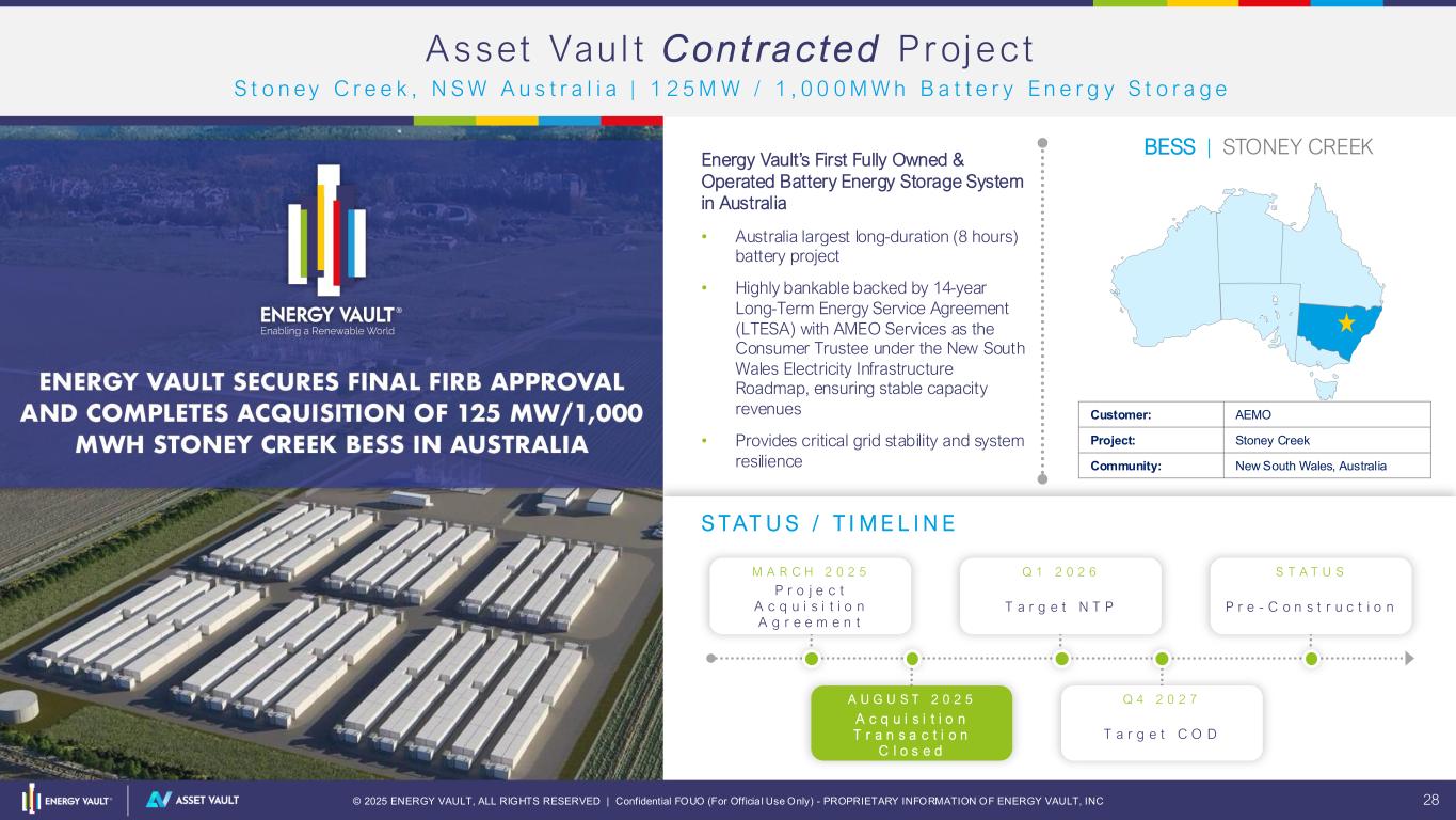 © 2025 ENERGY VAULT, ALL RIGHTS RESERVED | Confidential FOUO (For Officia l Use Only) - PROPRIETARY INFORMATION OF ENERGY VAULT, INC 27 A sset Vau l t Ac q u i red Proj ect S O S A , Te x a s U S A | 1 5 0 M W / 3 0 0 M W h B a t t e r y E n e r g y S t o r a g e P r o j e c t Late-stage Attractive Project Delivering Near-term Recurring Revenue • 40% ITC eligibility • Q4 2025 site mobilization for safe harbor FEOC • Multiple monetization options available • Project financing on the way BESS | SOSA Customer: ERCOT Project: SOSA Community: Madison County, Texas, USA S TAT U S / T I M E L I N E A U G U S T 2 0 2 5 Q 4 2 0 2 5 S T A T U S Q 1 2 0 2 7O C T 2 0 2 5 P r o j e c t A c q u i s i t i o n A g r e e m e n t T a r g e t N T P P r e - C o n s t r u c t i o n T a r g e t C O D A c q u i s i t i o n T r a n s a c t i o n C l o s e d
