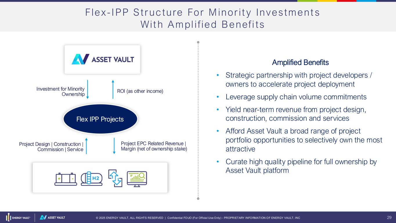 © 2025 ENERGY VAULT, ALL RIGHTS RESERVED | Confidential FOUO (For Officia l Use Only) - PROPRIETARY INFORMATION OF ENERGY VAULT, INC 29 F lex - I PP S t ruc ture For M inor i t y Inves tment s Wit h A mpl i f ied B enef i ts Amplified Benefits • Strategic partnership with project developers / owners to accelerate project deployment • Leverage supply chain volume commitments • Yield near-term revenue from project design, construction, commission and services • Afford Asset Vault a broad range of project portfolio opportunities to selectively own the most attractive • Curate high quality pipeline for full ownership by Asset Vault platform Flex IPP Projects Investment for Minority Ownership ROI (as other income) Project Design | Construction | Commission | Service Project EPC Related Revenue | Margin (net of ownership stake) Screenshot 2025-10- 08 at 11.23 AM Screenshot 2025-10-08 at 11.26.43 AM