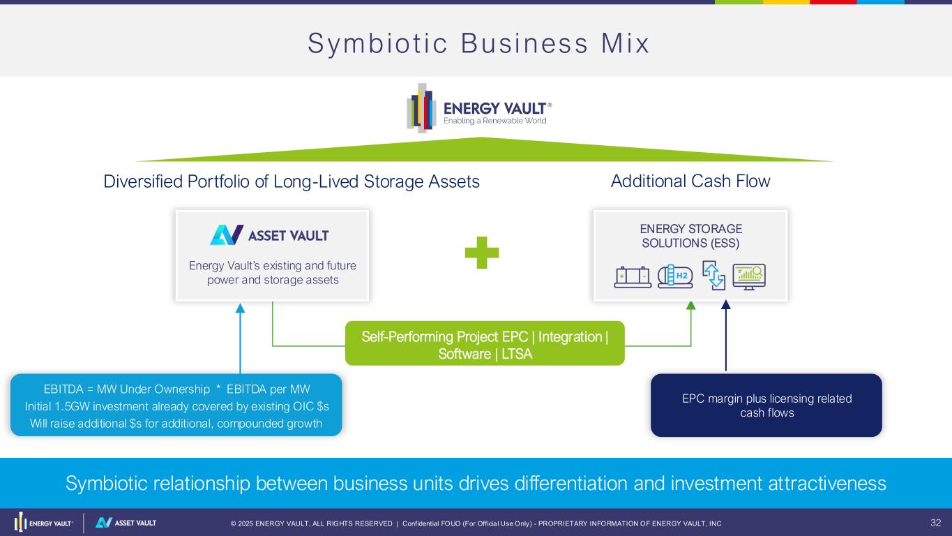 © 2025 ENERGY VAULT, ALL RIGHTS RESERVED | Confidential FOUO (For Officia l Use Only) - PROPRIETARY INFORMATION OF ENERGY VAULT, INC 31 Financing Act i v i ty Year-To-Date Up to $75M Corporate Debenture Financing $40M+ ITC Monetization Up to $300M Preferred Equity $35M Project Financing (Cross Trails & Calistoga) Deep & Robust Financial, Insurance and Working Capital Counterparties Seasoned Capital Market Team with Proven Track Record Disciplined Capital Management Reputable Suppliers, Partners and Customers