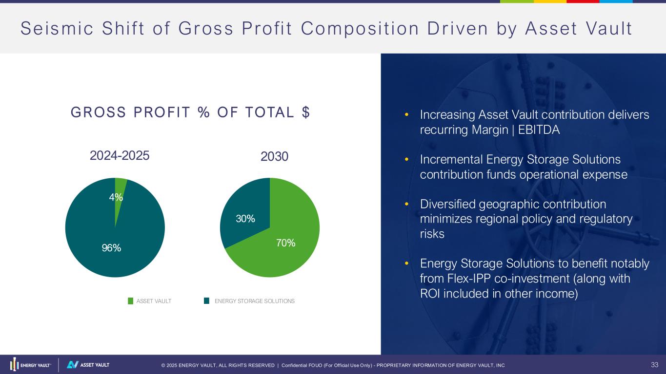 © 2025 ENERGY VAULT, ALL RIGHTS RESERVED | Confidential FOUO (For Officia l Use Only) - PROPRIETARY INFORMATION OF ENERGY VAULT, INC 32 Symbiot i c Business Mix Symbiotic relationship between business units drives differentiation and investment attractiveness Diversified Portfolio of Long-Lived Storage Assets Additional Cash Flow Energy Vault’s existing and future power and storage assets ENERGY STORAGE SOLUTIONS (ESS) Self-Performing Project EPC | Integration | Software | LTSA EBITDA = MW Under Ownership * EBITDA per MW Initial 1.5GW investment already covered by existing OIC $s Will raise additional $s for additional, compounded growth EPC margin plus licensing related cash flows