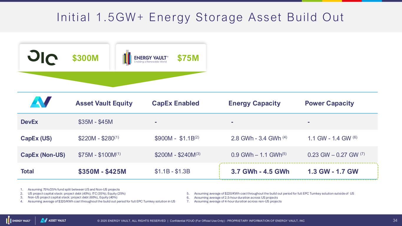 © 2025 ENERGY VAULT, ALL RIGHTS RESERVED | Confidential FOUO (For Officia l Use Only) - PROPRIETARY INFORMATION OF ENERGY VAULT, INC 33 Se ismic Shi f t o f Gross Pro fi t Composi t ion Dr iven by Asset Vau lt 2024-2025 2030 35% 54% 46% 96% 4% G R OSS P RO FIT % O F TOTAL $ ASSET VAULT ENERGY STORAGE SOLUTIONS 70% 30% • Increasing Asset Vault contribution delivers recurring Margin | EBITDA • Incremental Energy Storage Solutions contribution funds operational expense • Diversified geographic contribution minimizes regional policy and regulatory risks • Energy Storage Solutions to benefit notably from Flex-IPP co-investment (along with ROI included in other income)