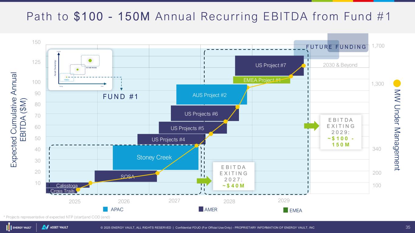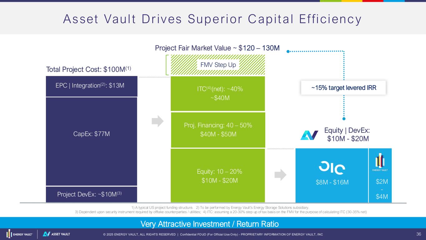 © 2025 ENERGY VAULT, ALL RIGHTS RESERVED | Confidential FOUO (For Officia l Use Only) - PROPRIETARY INFORMATION OF ENERGY VAULT, INC 34 In i t i a l 1 .5GW+ Energy Storage Asset Bu i ld Out $300M $75M 1. Assuming 75%/25% fund split between US and Non-US projects 2. US project capital stack: project debt (40%); ITC (35%); Equity (25%) 3. Non-US project capital stack: project debt (60%), Equity (40%) 4. Assuming average of $320/KWh cost throughout the build out period for full EPC Turnkey solution in US 5. Assuming average of $220/KWh cost throughout the build out period for full EPC Turnkey solution outside of US 6. Assuming average of 2.5-hour duration across US projects 7. Assuming average of 4-hour duration across non-US projects Asset Vault Equity CapEx Enabled Energy Capacity Power Capacity DevEx $35M - $45M - - - CapEx (US) $220M - $280(1) $900M - $1.1B(2) 2.8 GWh - 3.4 GWh (4) 1.1 GW - 1.4 GW (6) CapEx (Non-US) $75M - $100M(1) $200M - $240M(3) 0.9 GWh – 1.1 GWh(5) 0.23 GW – 0.27 GW (7) Total $350M - $425M $1.1B - $1.3B 3.7 GWh - 4.5 GWh 1.3 GW - 1.7 GW