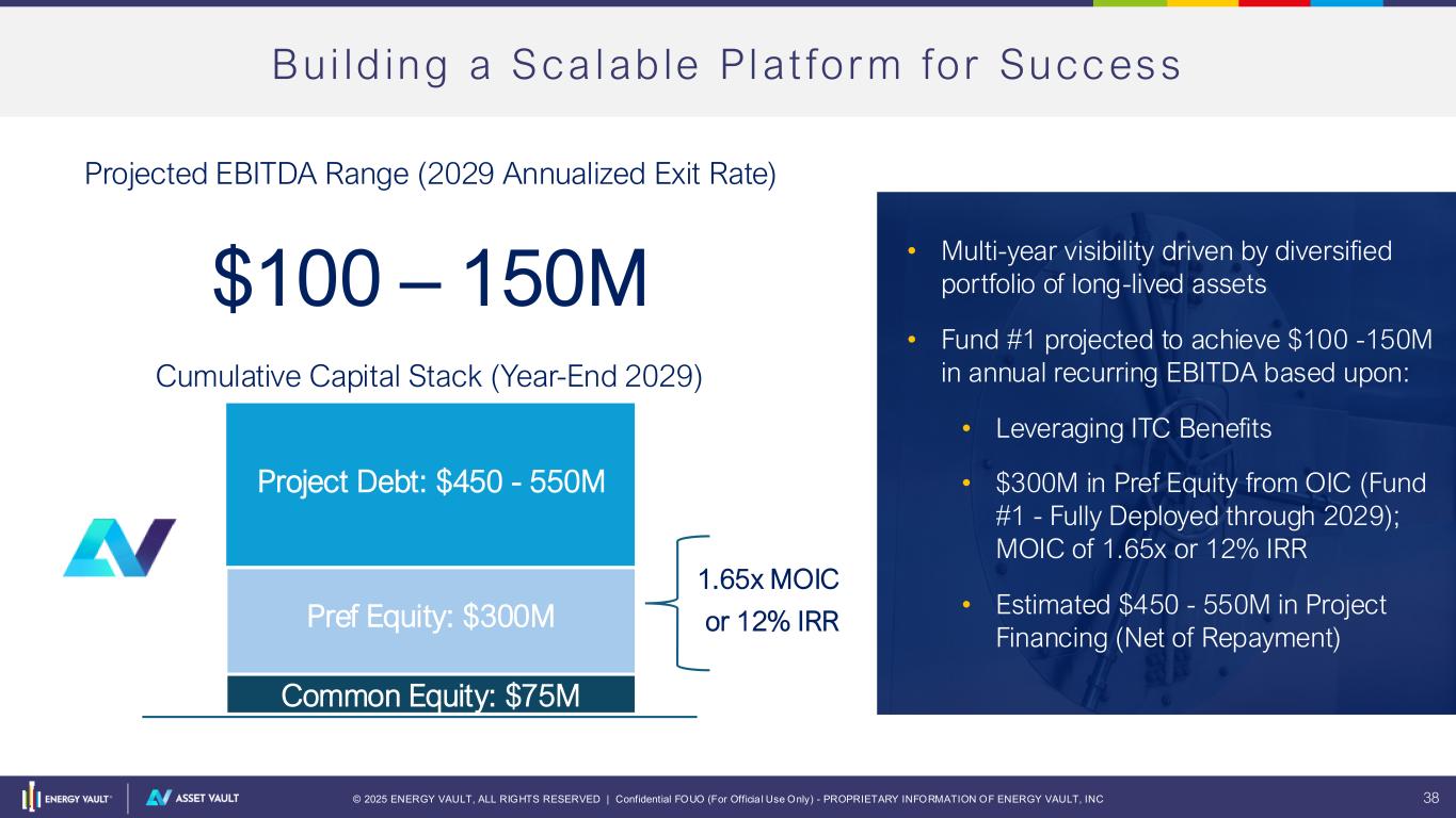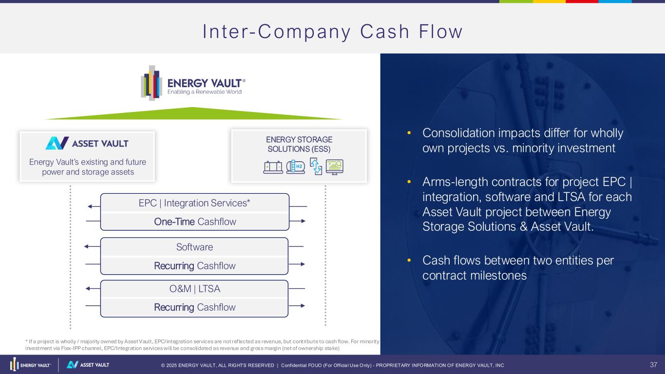 © 2025 ENERGY VAULT, ALL RIGHTS RESERVED | Confidential FOUO (For Officia l Use Only) - PROPRIETARY INFORMATION OF ENERGY VAULT, INC 37 In te r-Company Cash Flow EPC | Integration Services* One-Time Cashflow O&M | LTSA Recurring Cashflow Software Recurring Cashflow • Consolidation impacts differ for wholly own projects vs. minority investment • Arms-length contracts for project EPC | integration, software and LTSA for each Asset Vault project between Energy Storage Solutions & Asset Vault. • Cash flows between two entities per contract milestones Energy Vault’s existing and future power and storage assets ENERGY STORAGE SOLUTIONS (ESS) * If a project is wholly / majority owned by Asset Vault, EPC/integration services are not reflected as revenue, but contribute to cash flow. For minority investment via Flex-IPP channel, EPC/Integration services will be consolidated as revenue and gross margin (net of ownership stake)