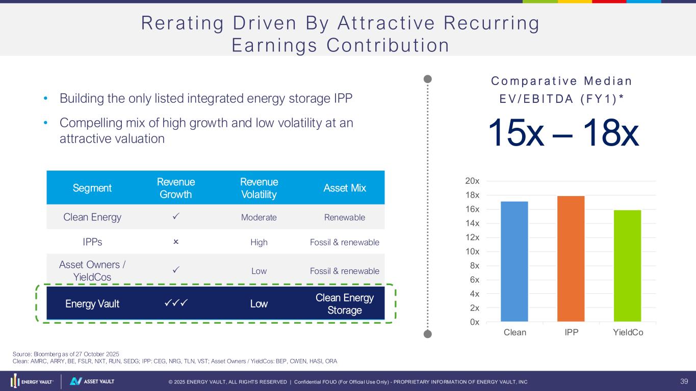 © 2025 ENERGY VAULT, ALL RIGHTS RESERVED | Confidential FOUO (For Officia l Use Only) - PROPRIETARY INFORMATION OF ENERGY VAULT, INC 38 Bui ld ing a Sca lab le Plat form for Success Cumulative Capital Stack (Year-End 2029) • Multi-year visibility driven by diversified portfolio of long-lived assets • Fund #1 projected to achieve $100 -150M in annual recurring EBITDA based upon: • Leveraging ITC Benefits • $300M in Pref Equity from OIC (Fund #1 - Fully Deployed through 2029); MOIC of 1.65x or 12% IRR • Estimated $450 - 550M in Project Financing (Net of Repayment) Common Equity: $75M Project Debt: $450 - 550M Projected EBITDA Range (2029 Annualized Exit Rate) $100 – 150M Pref Equity: $300M 1.65x MOIC or 12% IRR