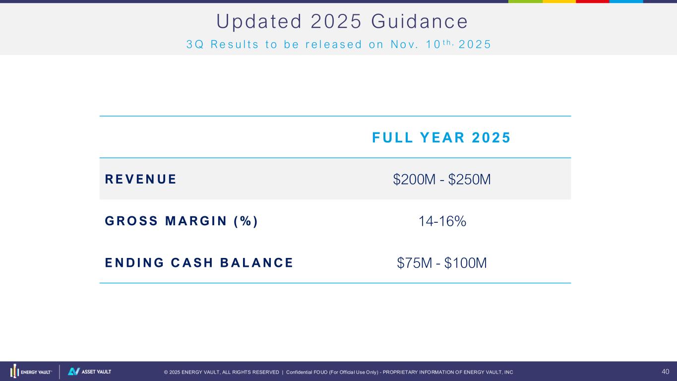 © 2025 ENERGY VAULT, ALL RIGHTS RESERVED | Confidential FOUO (For Officia l Use Only) - PROPRIETARY INFORMATION OF ENERGY VAULT, INC 40 Updated 2025 Guidance F U L L Y E A R 2 0 2 5 R E V E N U E $200M - $250M G R O S S M A R G I N ( % ) 14-16% E N D I N G C A S H B A L A N C E $75M - $100M 3 Q R e s u l t s t o b e r e l e a s e d o n N o v. 1 0 t h , 2 0 2 5