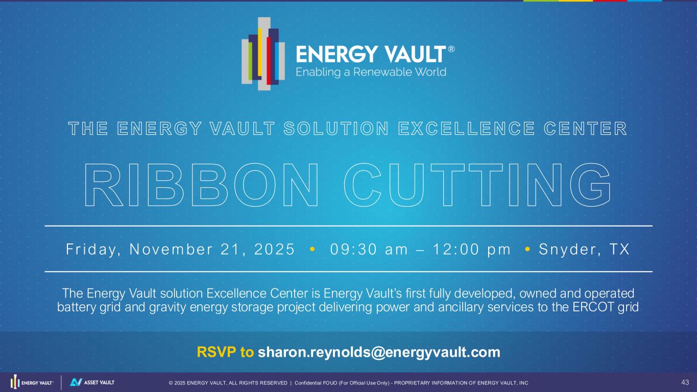 © 2025 ENERGY VAULT, ALL RIGHTS RESERVED | Confidential FOUO (For Officia l Use Only) - PROPRIETARY INFORMATION OF ENERGY VAULT, INC 43 THE ENE RGY VAU LT SOLUTION EX CELLE NCE CE NTE R RIBBON CUTTING Fr id ay, N ove m be r 21 , 20 25 • 0 9: 30 a m – 1 2 : 00 p m • S n y de r, TX The Energy Vault solution Excellence Center is Energy Vault’s first fully developed, owned and operated battery grid and gravity energy storage project delivering power and ancillary services to the ERCOT grid RSVP to sharon.reynolds@energyvault.com
