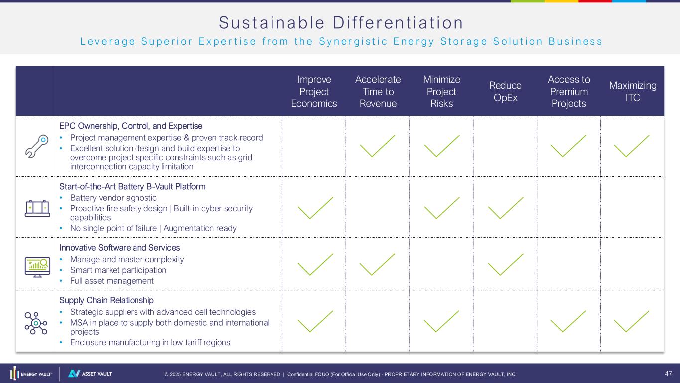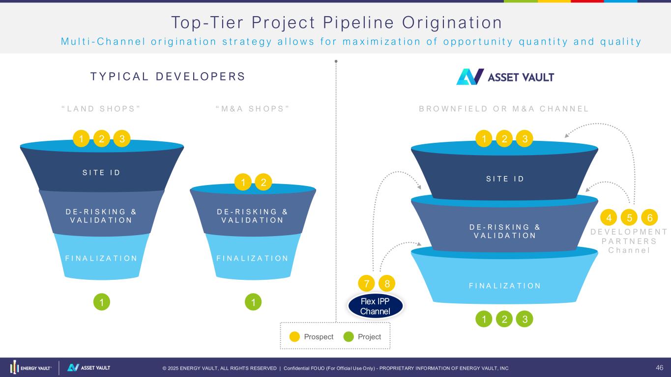 © 2025 ENERGY VAULT, ALL RIGHTS RESERVED | Confidential FOUO (For Officia l Use Only) - PROPRIETARY INFORMATION OF ENERGY VAULT, INC 46 Top -Tie r Pr o jec t P i pe l i ne O r ig ina t i on M u l t i - C h a n n e l o r i g i n a t i o n s t r a t e g y a l l o w s f o r m a x i m i z a t i o n o f o p p o r t u n i t y q u a n t i t y a n d q u a l i t y Prospect Project T Y P I C A L D E V E L O P E R S D E - R I S K I N G & V A L I D A T I O N F I N A L I Z A T I O N D E - R I S K I N G & V A L I D A T I O N F I N A L I Z A T I O N S I T E I D D E - R I S K I N G & V A L I D A T I O N F I N A L I Z A T I O N S I T E I D “ L A N D S H O P S ” “ M & A S H O P S ” B R O W N F I E L D O R M & A C H A N N E L 1 2 3 1 2 1 1 1 2 3 1 2 3 4 5 6 7 8 D E V E L O P M E N T P A R T N E R S C h a n n e l Flex IPP Channel