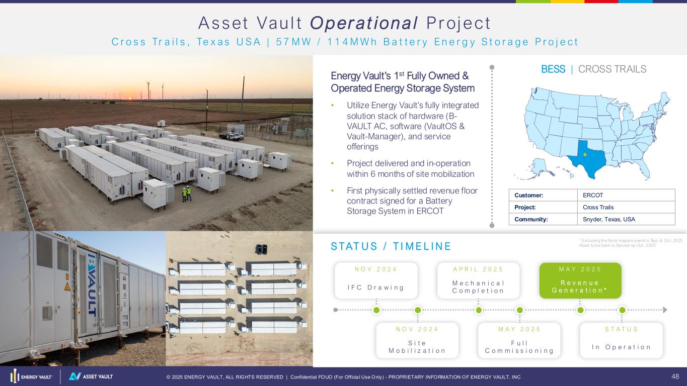 © 2025 ENERGY VAULT, ALL RIGHTS RESERVED | Confidential FOUO (For Officia l Use Only) - PROPRIETARY INFORMATION OF ENERGY VAULT, INC 47 Sus t a inab le D i f fe ren t ia t i on L e v e r a g e S u p e r i o r E x p e r t i s e f r o m t h e S y n e r g i s t i c E n e r g y S t o r a g e S o l u t i o n B u s i n e s s Improve Project Economics Accelerate Time to Revenue Minimize Project Risks Reduce OpEx Access to Premium Projects Maximizing ITC EPC Ownership, Control, and Expertise • Project management expertise & proven track record • Excellent solution design and build expertise to overcome project specific constraints such as grid interconnection capacity limitation Start-of-the-Art Battery B-Vault Platform • Battery vendor agnostic • Proactive fire safety design | Built-in cyber security capabilities • No single point of failure | Augmentation ready Innovative Software and Services • Manage and master complexity • Smart market participation • Full asset management Supply Chain Relationship • Strategic suppliers with advanced cell technologies • MSA in place to supply both domestic and international projects • Enclosure manufacturing in low tariff regions