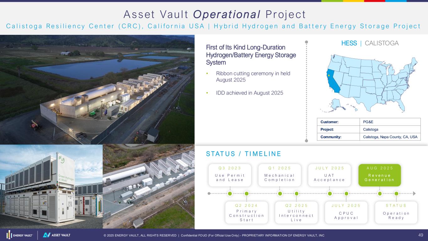 © 2025 ENERGY VAULT, ALL RIGHTS RESERVED | Confidential FOUO (For Officia l Use Only) - PROPRIETARY INFORMATION OF ENERGY VAULT, INC 49 A sset Vau l t O p erat iona l Pr oj ect C a l i s t o g a R e s i l i e n c y C e n t e r ( C R C ) , C a l i f o r n i a U S A | H y b r i d H y d r o g e n a n d B a t t e r y E n e r g y S t o r a g e P r o j e c t First of Its Kind Long-Duration Hydrogen/Battery Energy Storage System • Ribbon cutting ceremony in held August 2025 • IDD achieved in August 2025 HESS | CALISTOGA S TAT U S / T I M E L I N E Q 3 2 0 2 3 S T A T U SQ 2 2 0 2 5Q 2 2 0 2 4 O p e r a t i o n R e a d y Q 1 2 0 2 5 J U L Y 2 0 2 5 A U G 2 0 2 5 J U L Y 2 0 2 5 C P U C A p p r o v a l U t i l i t y I n t e r c o n n e c t L i v e P r i m a r y C o n s t r u c t i o n S t a r t R e v e n u e G e n e r a t i o n U A T A c c e p t a n c e M e c h a n i c a l C o m p l e t i o n U s e P e r m i t a n d L e a s e Customer: PG&E Project: Calistoga Community: Calistoga, Napa County, CA, USA