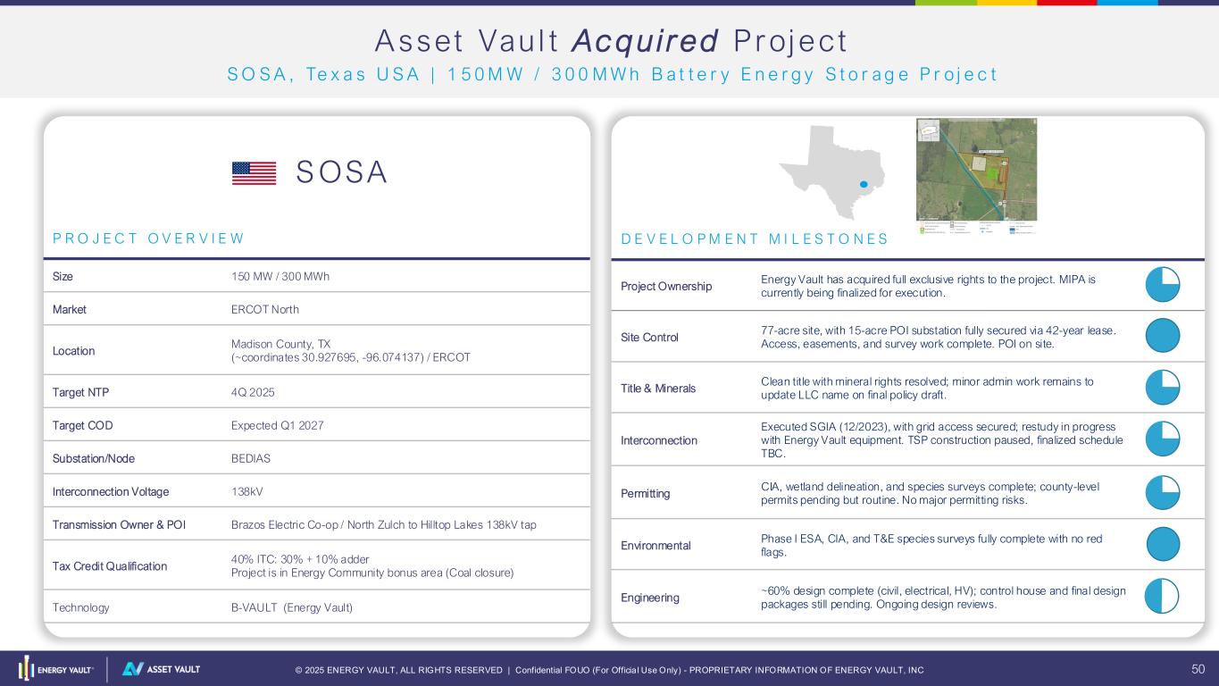 © 2025 ENERGY VAULT, ALL RIGHTS RESERVED | Confidential FOUO (For Officia l Use Only) - PROPRIETARY INFORMATION OF ENERGY VAULT, INC 50 Screenshot 2025-10-08 at 11.26.43 AMScreenshot 2025-10-08 at 11.26.43 AM A sset Vau l t Ac q u i red Proj ect S O S A , Te x a s U S A | 1 5 0 M W / 3 0 0 M W h B a t t e r y E n e r g y S t o r a g e P r o j e c t P R O J E C T O V E R V I E W Size 150 MW / 300 MWh Market ERCOT North Location Madison County, TX (~coordinates 30.927695, -96.074137) / ERCOT Target NTP 4Q 2025 Target COD Expected Q1 2027 Substation/Node BEDIAS Interconnection Voltage 138kV Transmission Owner & POI Brazos Electric Co-op / North Zulch to Hilltop Lakes 138kV tap Tax Credit Qualification 40% ITC: 30% + 10% adder Project is in Energy Community bonus area (Coal closure) Technology B-VAULT (Energy Vault) D E V E L O P M E N T M I L E S T O N E S Project Ownership Energy Vault has acquired full exclusive rights to the project. MIPA is currently being finalized for execution. Site Control 77-acre site, with 15-acre POI substation fully secured via 42-year lease. Access, easements, and survey work complete. POI on site. Title & Minerals Clean title with mineral rights resolved; minor admin work remains to update LLC name on final policy draft. Interconnection Executed SGIA (12/2023), with grid access secured; restudy in progress with Energy Vault equipment. TSP construction paused, finalized schedule TBC. Permitting CIA, wetland delineation, and species surveys complete; county-level permits pending but routine. No major permitting risks. Environmental Phase I ESA, CIA, and T&E species surveys fully complete with no red flags. Engineering ~60% design complete (civil, electrical, HV); control house and final design packages still pending. Ongoing design reviews. S OSA