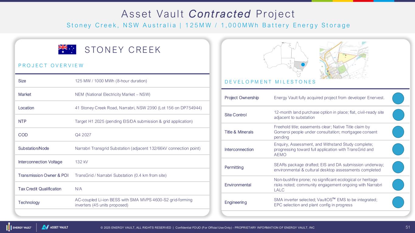 © 2025 ENERGY VAULT, ALL RIGHTS RESERVED | Confidential FOUO (For Officia l Use Only) - PROPRIETARY INFORMATION OF ENERGY VAULT, INC 51 Screenshot 2025-10-08 at 11.26.43 AMScreenshot 2025-10-08 at 11.26.43 AM A sset Vau l t Cont racted Proj ect S t o n e y C r e e k , N S W A u s t r a l i a | 1 2 5 M W / 1 , 0 0 0 M W h B a t t e r y E n e r g y S t o r a g e STO N EY C RE EK P R O J E C T O V E R V I E W Size 125 MW / 1000 MWh (8-hour duration) Market NEM (National Electricity Market – NSW) Location 41 Stoney Creek Road, Narrabri, NSW 2390 (Lot 156 on DP754944) NTP Target H1 2025 (pending EIS/DA submission & grid application) COD Q4 2027 Substation/Node Narrabri Transgrid Substation (adjacent 132/66kV connection point) Interconnection Voltage 132 kV Transmission Owner & POI TransGrid / Narrabri Substation (0.4 km from site) Tax Credit Qualification N/A Technology AC-coupled Li-ion BESS with SMA MVPS 4600-S2 grid-forming inverters (45 units proposed) D E V E L O P M E N T M I L E S T O N E S Project Ownership Energy Vault fully acquired project from developer Enervest. 4 Site Control 12-month land purchase option in place; flat, civil-ready site adjacent to substation 4 Title & Minerals Freehold title; easements clear; Native Title claim by Gomeroi people under consultation; mortgagee consent pending 3 Interconnection Enquiry, Assessment, and Withstand Study complete; progressing toward full application with TransGrid and AEMO 3 Permitting SEARs package drafted; EIS and DA submission underway; environmental & cultural desktop assessments completed 3 Environmental Non-bushfire prone; no significant ecological or heritage risks noted; community engagement ongoing with Narrabri LALC 4 Engineering SMA inverter selected; VaultOS EMS to be integrated; EPC selection and plant config in progress 2