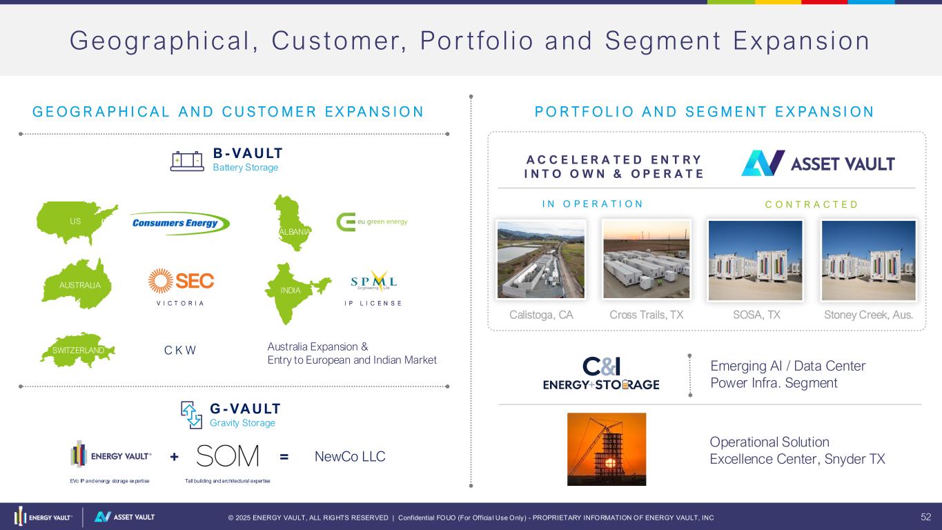 © 2025 ENERGY VAULT, ALL RIGHTS RESERVED | Confidential FOUO (For Officia l Use Only) - PROPRIETARY INFORMATION OF ENERGY VAULT, INC 52 Geograph ical , Customer, Por t fo l io and Segment Expansion P O R T F O L I O A N D S E G M E N T E X P A N S I O N B - VA U LT Battery Storage US AUSTRALIA V I C T O R I A C K WSWITZERLAND ALBANIA INDIA Australia Expansion & Entry to European and Indian Market G - VA U LT Gravity Storage G E O G R A P H I C A L A N D C U S TO M E R E X P A N S I O N I P L I C E N S E Calistoga, CA Cross Trails, TX I N O P E R A T I O N C O N T R A C T E D SOSA, TX Stoney Creek, Aus. A C C E L E R A T E D E N T R Y I N T O O W N & O P E R A T E EVu Operational Solution Excellence Center, Snyder TX Emerging AI / Data Center Power Infra. Segment + = EVc IP and energy storage expertise Tall building and architectural expertise NewCo LLC
