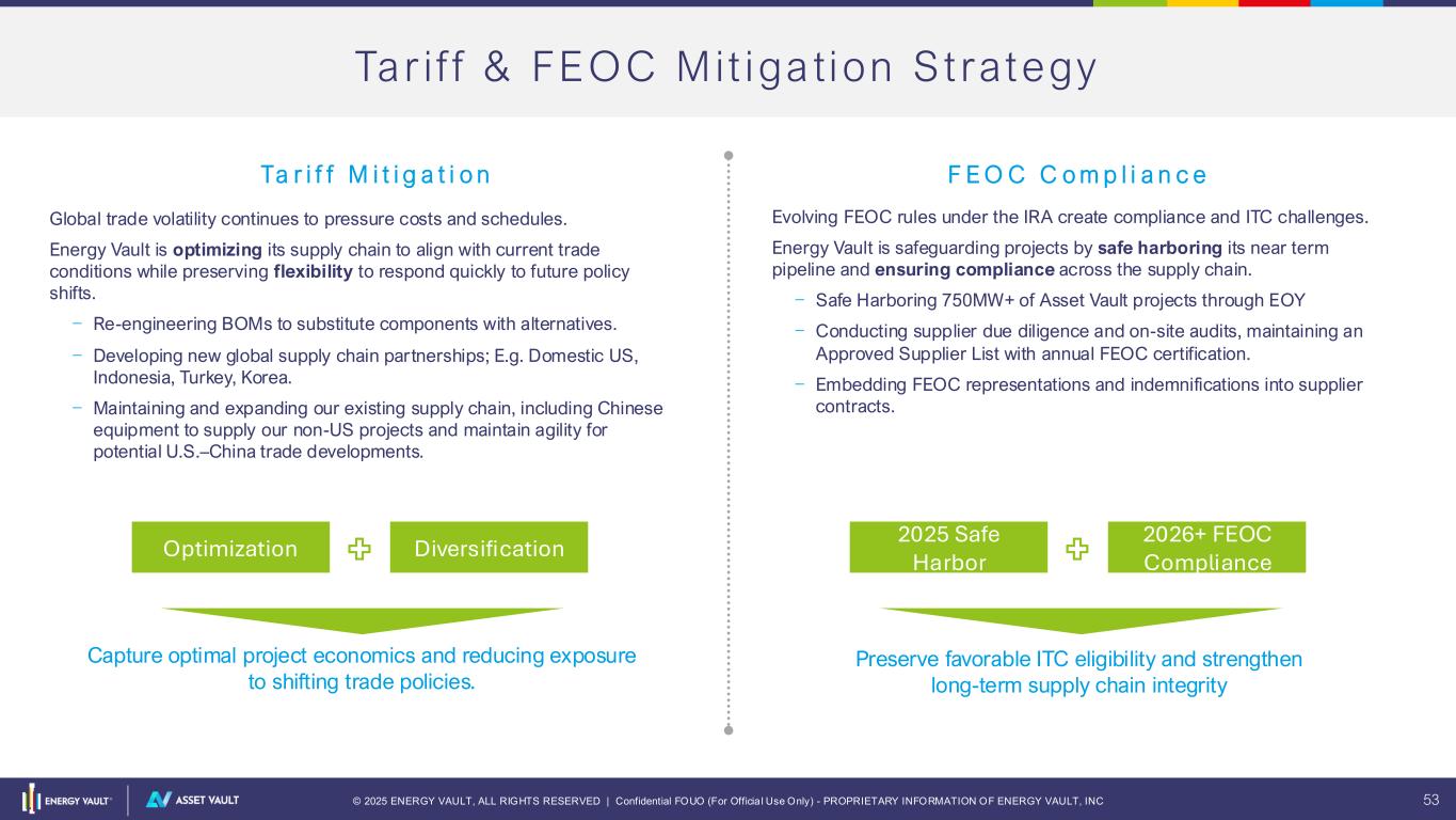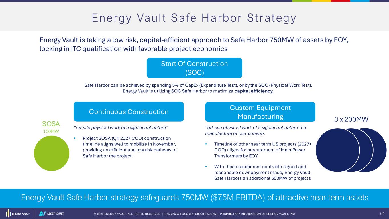© 2025 ENERGY VAULT, ALL RIGHTS RESERVED | Confidential FOUO (For Officia l Use Only) - PROPRIETARY INFORMATION OF ENERGY VAULT, INC 53 Tar i f f & FEOC Mit iga tion St rategy Ta r i f f M i t i g a t i o n F E O C C o m p l i a n c e Global trade volatility continues to pressure costs and schedules. Energy Vault is optimizing its supply chain to align with current trade conditions while preserving flexibility to respond quickly to future policy shifts. – Re-engineering BOMs to substitute components with alternatives. – Developing new global supply chain partnerships; E.g. Domestic US, Indonesia, Turkey, Korea. – Maintaining and expanding our existing supply chain, including Chinese equipment to supply our non-US projects and maintain agility for potential U.S.–China trade developments. Evolving FEOC rules under the IRA create compliance and ITC challenges. Energy Vault is safeguarding projects by safe harboring its near term pipeline and ensuring compliance across the supply chain. – Safe Harboring 750MW+ of Asset Vault projects through EOY – Conducting supplier due diligence and on-site audits, maintaining an Approved Supplier List with annual FEOC certification. – Embedding FEOC representations and indemnifications into supplier contracts. Capture optimal project economics and reducing exposure to shifting trade policies. Preserve favorable ITC eligibility and strengthen long-term supply chain integrity Optimization Diversification 2025 Safe Harbor 2026+ FEOC Compliance