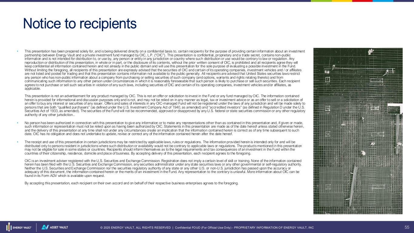 © 2025 ENERGY VAULT, ALL RIGHTS RESERVED | Confidential FOUO (For Officia l Use Only) - PROPRIETARY INFORMATION OF ENERGY VAULT, INC 55 Notice to recipients • This presentation has been prepared solely for, and is being delivered directly on a confidential basis to, certain recipients for the purpose of providing certain information about an investment partnership between Energy Vault and a private investment fund managed by OIC, L.P. (“OIC”). This presentation is confidential, proprietary and a trade secret, contains non-public information and is not intended for distribution to, or use by, any person or entity in any jurisdiction or country where such distribution or use would be contrary to law or regulation. Any reproduction or distribution of this presentation, in whole or in part, or the disclosure of its contents, without the prior written consent of OIC, is prohibited and all recipients agree they will keep confidential all information contained herein and not already in the public domain and will use this presentation for the sole purpose of evaluating a possible investment in the Fund. Without limiting the foregoing, all recipients of this presentation are expressly advised that the securities of OIC and certain of its operating companies, investment vehicles and / or affiliates are not listed and posted for trading and that this presentation contains information not available to the public generally. All recipients are advised that United States securities laws restrict any person who has non-public information about a company from purchasing or selling securities of such company (and options, warrants and rights relating thereto) and from communicating such information to any other person under circumstances in which it is reasonably foreseeable that such person is likely to purchase or sell such securities. Each recipient agrees to not purchase or sell such securities in violation of any such laws, including securities of OIC and certain of its operating companies, investment vehicles and/or affiliates, as applicable. This presentation is not an advertisement for any product managed by OIC. This is not an offer or solicitation to invest in the Fund or any fund managed by OIC. The information contained herein is provided for informational and discussion purposes only and is not, and may not be relied on in any manner as legal , tax or investment advice or as an offer to sell or a solicitation of an offer to buy any interest or securities of any issuer. Offers and sales of interests in any OIC-managed Fund will not be registered under the laws of any jurisdiction and will be made solely to persons that are both “qualified purchasers” (as defined under the U.S. Investment Company Act of 1940, as amended) and “accredited investors” (as defined in Regulation D under the U.S. Securities Act of 1933, as amended). The securities of the Fund will not be recommended, approved or disapproved by any U.S. federal or state securities commission or any other regulatory authority of any other jurisdiction.. • No person has been authorized in connection with this presentation to give any information or to make any representations other than as contained in this presentation and, if given or made, such information or representation must not be relied upon as having been authorized by OIC. Statements in this presentation are made as of the date hereof unless stated otherwise herein, and the delivery of this presentation at any time shall not under any circumstances create an implication that the information contained herein is correct as of any time subsequent to such date. OIC has no obligation and does not undertake to update, revise or correct any of the information contained herein after the date hereof. • The receipt and use of this presentation in certain jurisdictions may be restricted by applicable laws, rules or regulations. The information provided herein is intended only for and will be distributed only to persons resident in jurisdictions where such distribution or availability would not be contrary to applicable laws or regulations. The products mentioned in this presentation may not be eligible for sale in some states or countries. Recipients should inform themselves as to the legal requirements and tax consequences of an investment in the Fund within the countries of their citizenship, residence, domicile and place of business. By accepting delivery of this presentation, each recipient agrees to the foregoing. OIC is an investment adviser registered with the U.S. Securities and Exchange Commission. Registration does not imply a certain level of skill or training. None of the information contained herein has been filed with the U.S. Securities and Exchange Commission, any securities administrator under any state securities laws or any other governmental or self-regulatory authority. Neither the U.S. Securities and Exchange Commission nor the securities regulatory authority of any state or any other U.S. or non-U.S. jurisdiction has passed upon the accuracy or adequacy of this document, the information contained herein or the merits of an investment in the Fund. Any representation to the contrary is unlawful. More information about OIC can be found in its Form ADV which is available upon request. By accepting this presentation, each recipient on their own accord and on behalf of their respective business enterprises agrees to the foregoing.