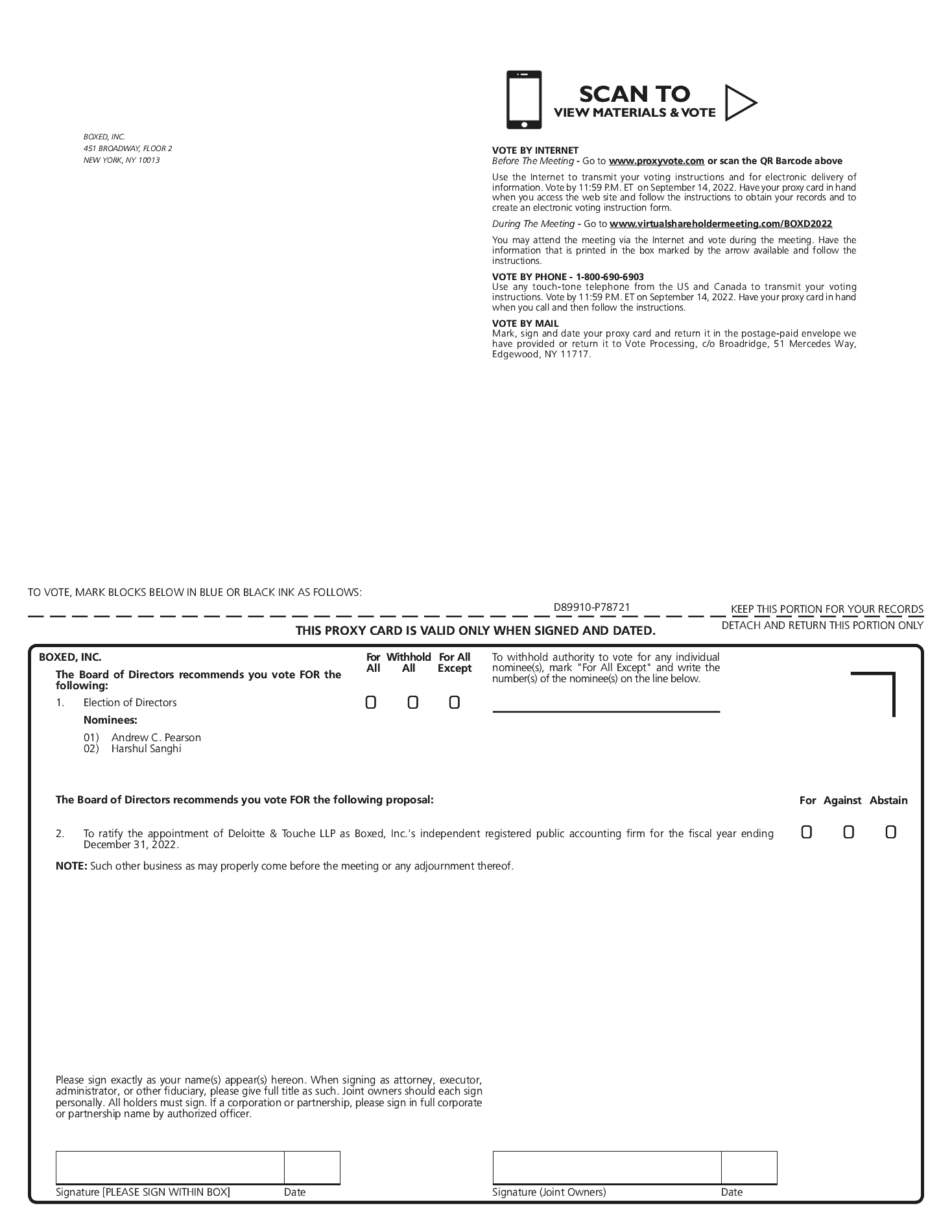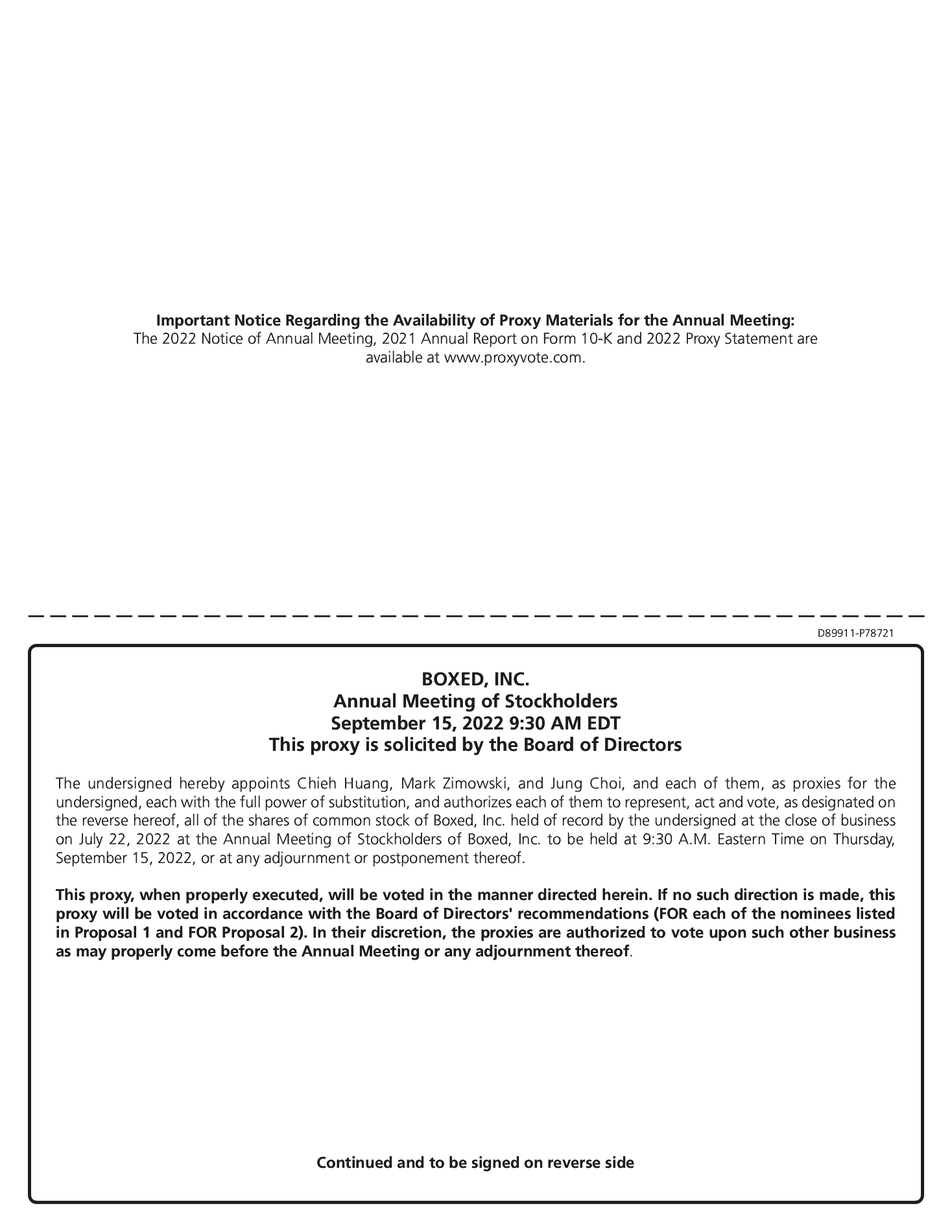 vesting provisions: half of the Earnout Shares will become vested if, within the Earnout Period, our common stock trades at greater than $12.00 per share for any twenty (20) trading days within any consecutive thirty (30) trading day period, and with the remainder of the Earnout Shares to be released if, within the Earnout Period, our common stock trades at greater than $14.00 per share for any twenty (20) trading days within any consecutive thirty (30) trading day period. Notwithstanding the foregoing, the Earnout Shares will vest in the event of a sale of Boxed at a price that is equal to or greater than the redemption price payable to our stockholders. Founder Shares subject to vesting pursuant to the above terms that do not vest in accordance with such terms shall be forfeited. With certain exceptions, the Sponsor and Jones agreed that it will not transfer any Founder Shares until 180 days after (and excluding) the Closing (the “Lock-up Period”), consistent with the provisions under Section 7.12 of our bylaws.