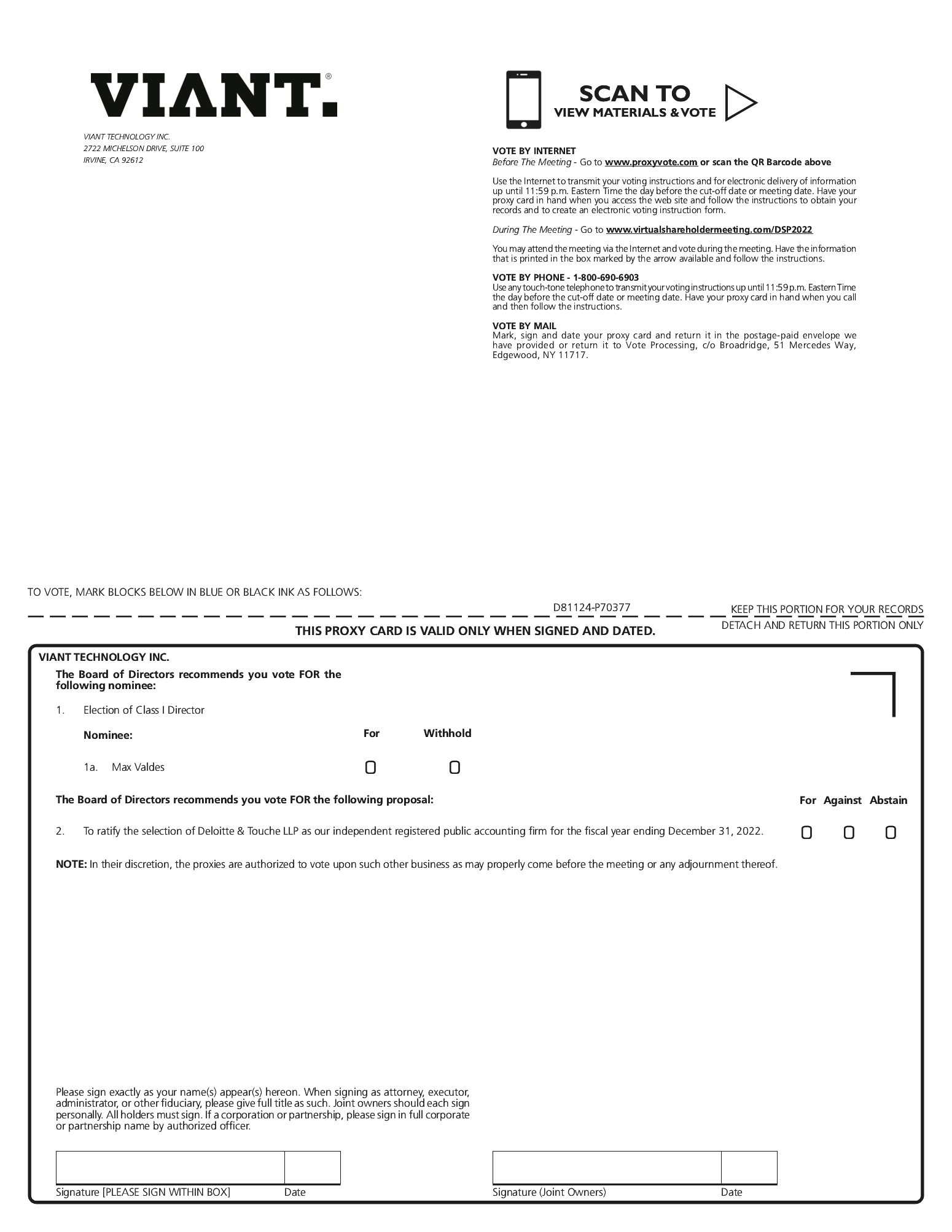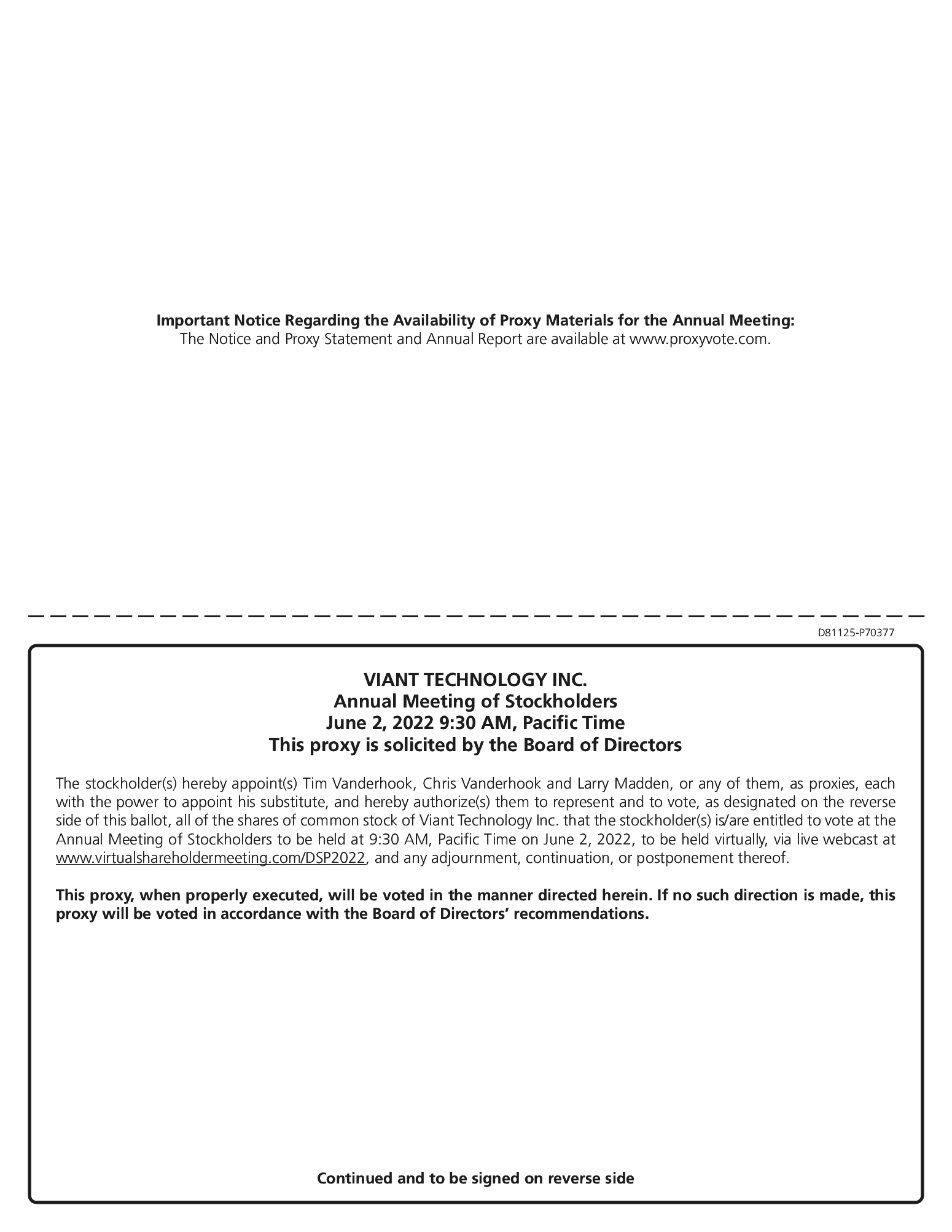 A stockholder that wishes to recommend a candidate for election to the board of directors may send a letter directed to our Corporate Secretary at 2722 Michelson Drive, Suite 100 Irvine, California 92612. The letter must include, among other things, the candidate’s name, business and residence address, biographical data, and the number of Viant shares held. Additional information regarding the process and required information to properly and timely submit stockholder nominations for candidates for membership on our board of directors is set forth in our amended and restated bylaws.