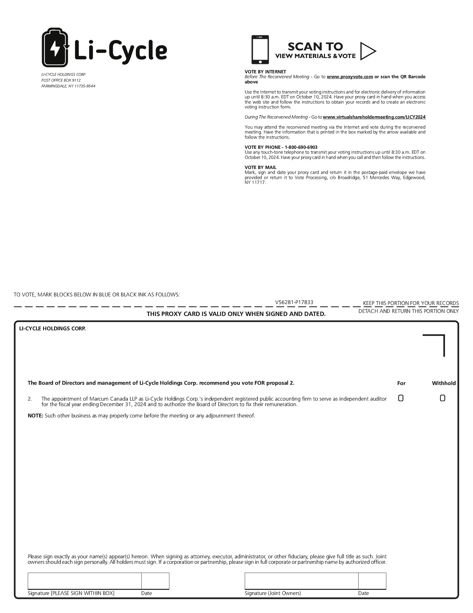 Notice (the “Notice of Reconvened Meeting”) is hereby given that the reconvened annual general and special meeting (the “Reconvened Meeting”) of the holders (the “Shareholders”) of common shares (the “Shares”) in the capital of Li-Cycle Holdings Corp. (the “Company”) will be held on Tuesday, October 15, 2024, at 8:30 a.m., (Eastern Daylight Time) via live audio webcast online at www.virtualshareholdermeeting.com/LICY2024 for the purpose of considering, and if deemed advisable, appointing Marcum Canada LLP as the Company’s independent registered public accounting firm to serve as independent auditor until the close of the next annual meeting of Shareholders or until their successor is appointed and authorizing the Company’s board of directors to fix the auditor’s remuneration.