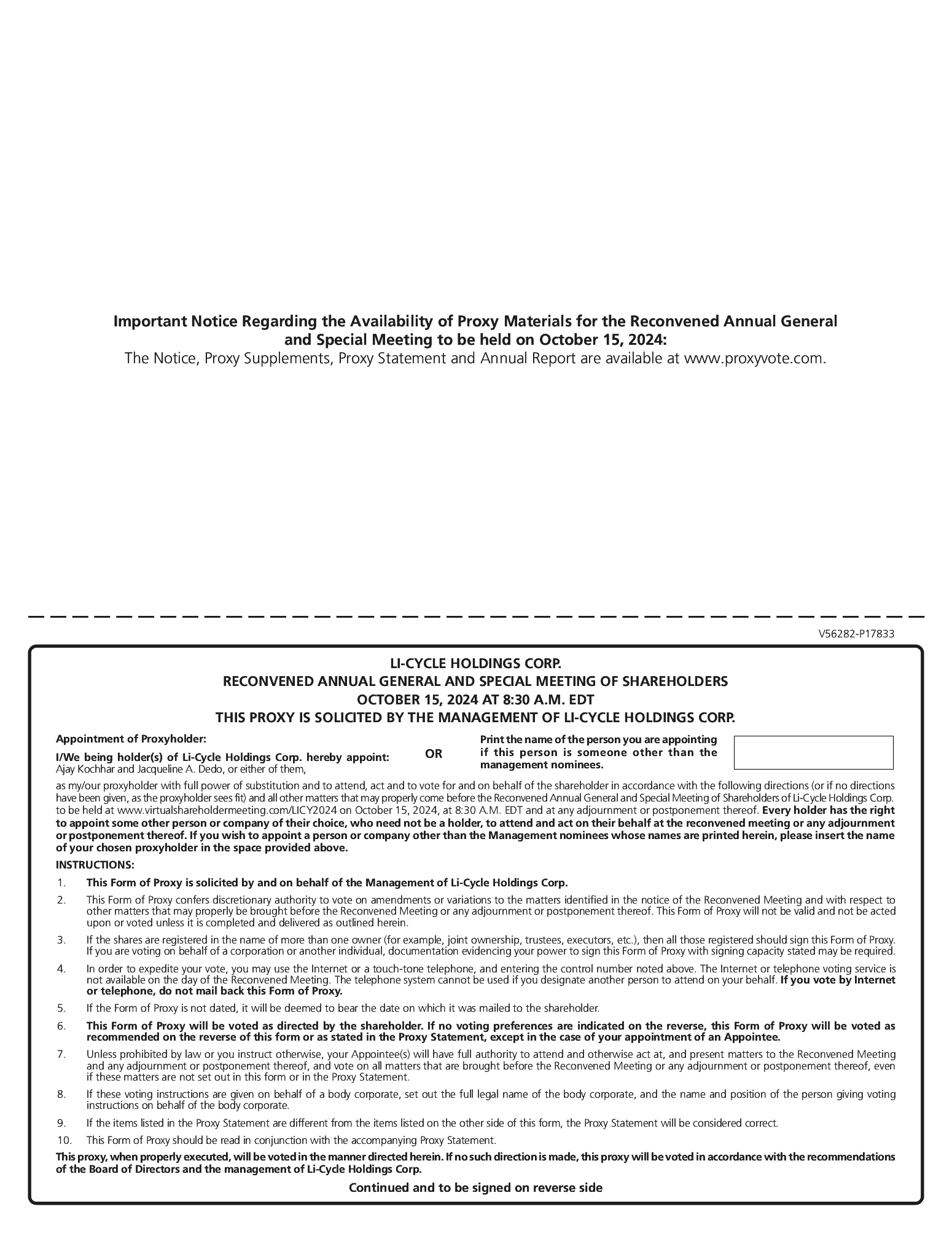 The enclosed Supplement, our definitive proxy statement dated April 12, 2024 (the “Proxy Statement”), any other proxy supplements and our annual report will also be available at www.virtualshareholdermeeting.com/LICY2024, on our website at https://investors.li-cycle.com/events-and-presentations/, on SEDAR+ at www.SEDARplus.com, and on EDGAR at www.sec.gov. Information contained on, or that can be accessed through, our website does not constitute a part of this proxy statement and is not incorporated by reference herein.