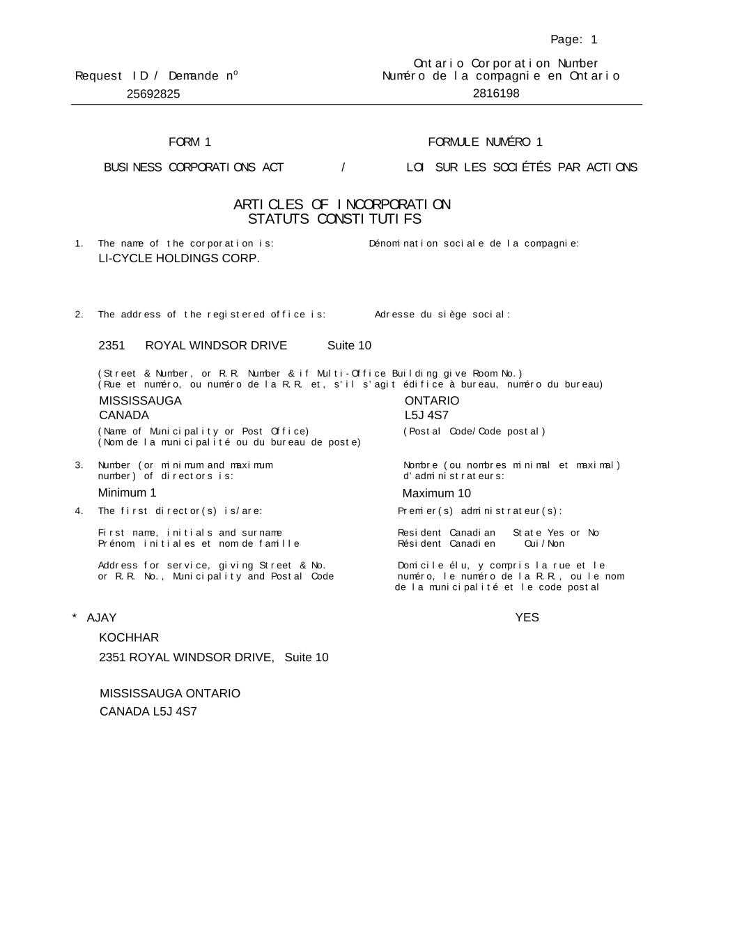 Page: Ontario Corporation Number Request ID / Demande no Numéro de la compagnie en Ontario FORM 1 FORMULE NUMÉRO 1 BUSINESS CORPORATIONS ACT / LOI SUR LES SOCIÉTÉS PAR ACTIONS ARTICLES OF INCORPORATION STATUTS CONSTITUTIFS 1. The name of the corporation is: Dénomination sociale de la compagnie: 2. The address of the registered office is: Adresse du siège social: (Street & Number, or R.R. Number & if Multi-Office Building give Room No.) (Rue et numéro, ou numéro de la R.R. et, s’il s’agit édifice à bureau, numéro du bureau) (Name of Municipality or Post Office) (Postal Code/Code postal) (Nom de la municipalité ou du bureau de poste) 3. Number (or minimum and maximum Nombre (ou nombres minimal et maximal) number) of directors is: d’administrateurs: 4. The first director(s) is/are: Premier(s) administrateur(s): First name, initials and surname Resident Canadian State Yes or No Prénom, initiales et nom de famille Résident Canadien Oui/Non Address for service, giving Street & No. Domicile élu, y compris la rue et le or R.R. No., Municipality and Postal Code numéro, le numéro de la R.R., ou le nom de la municipalité et le code postal CANADA L5J 4S7 1 281619825692825 LI-CYCLE HOLDINGS CORP. 2351 ROYAL WINDSOR DRIVE Suite 10 MISSISSAUGA CANADA ONTARIO L5J 4S7 Minimum 1 Maximum 10 * AJAY KOCHHAR YES 2351 ROYAL WINDSOR DRIVE, Suite 10 MISSISSAUGA ONTARIO