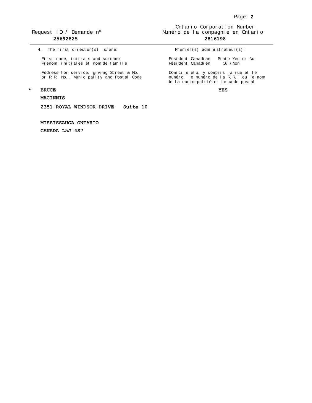 Page: Ontario Corporation Number Request ID / Demande no Numéro de la compagnie en Ontario 4. The first director(s) is/are: Premier(s) administrateur(s): First name, initials and surname Resident Canadian State Yes or No Prénom, initiales et nom de famille Résident Canadien Oui/Non Address for service, giving Street & No. Domicile élu, y compris la rue et le or R.R. No., Municipality and Postal Code numéro, le numéro de la R.R., ou le nom de la municipalité et le code postal 2 25692825 2816198 * BRUCE YES MACINNIS MISSISSAUGA ONTARIO CANADA L5J 4S7 2351 ROYAL WINDSOR DRIVE Suite 10
