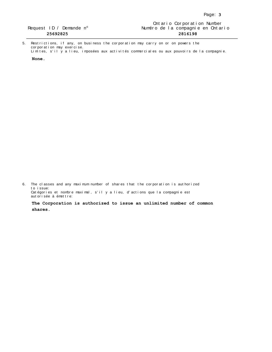 Page: Ontario Corporation Number Request ID / Demande no Numéro de la compagnie en Ontario 5. Restrictions, if any, on business the corporation may carry on or on powers the corporation may exercise. Limites, s’il y a lieu, imposées aux activités commerciales ou aux pouvoirs de la compagnie. 6. The classes and any maximum number of shares that the corporation is authorized to issue: Catégories et nombre maximal, s’il y a lieu, d’actions que la compagnie est autorisée à émettre: 3 25692825 2816198 None. The Corporation is authorized to issue an unlimited number of common shares.