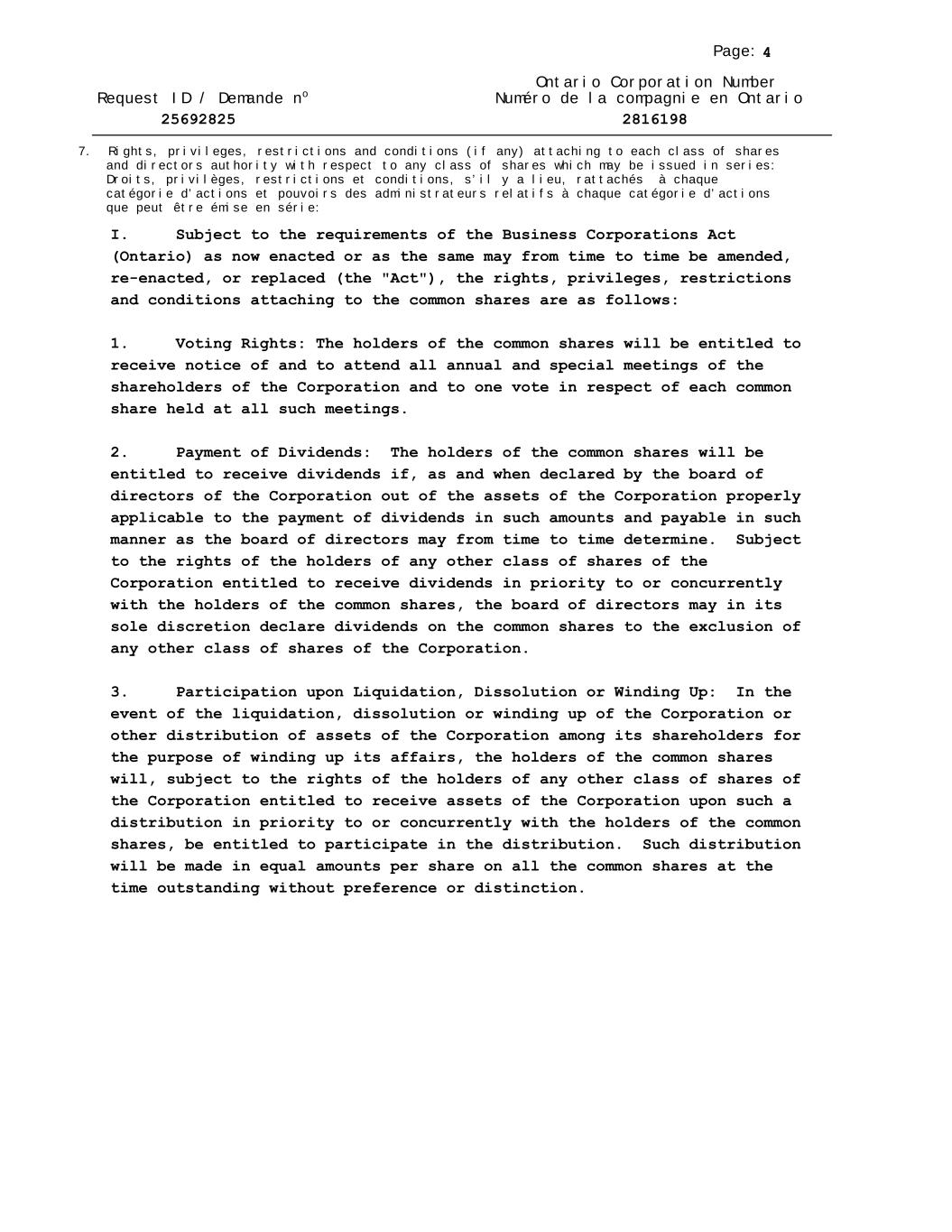 Page: Ontario Corporation Number Request ID / Demande no Numéro de la compagnie en Ontario 7. Rights, privileges, restrictions and conditions (if any) attaching to each class of shares and directors authority with respect to any class of shares which may be issued in series: Droits, privilèges, restrictions et conditions, s’il y a lieu, rattachés à chaque catégorie d’actions et pouvoirs des administrateurs relatifs à chaque catégorie d’actions que peut être émise en série: 4 25692825 2816198 I. Subject to the requirements of the Business Corporations Act (Ontario) as now enacted or as the same may from time to time be amended, re-enacted, or replaced (the "Act"), the rights, privileges, restrictions and conditions attaching to the common shares are as follows: 1. Voting Rights: The holders of the common shares will be entitled to receive notice of and to attend all annual and special meetings of the shareholders of the Corporation and to one vote in respect of each common share held at all such meetings. 2. Payment of Dividends: The holders of the common shares will be entitled to receive dividends if, as and when declared by the board of directors of the Corporation out of the assets of the Corporation properly applicable to the payment of dividends in such amounts and payable in such manner as the board of directors may from time to time determine. Subject to the rights of the holders of any other class of shares of the Corporation entitled to receive dividends in priority to or concurrently with the holders of the common shares, the board of directors may in its sole discretion declare dividends on the common shares to the exclusion of any other class of shares of the Corporation. 3. Participation upon Liquidation, Dissolution or Winding Up: In the event of the liquidation, dissolution or winding up of the Corporation or other distribution of assets of the Corporation among its shareholders for the purpose of winding up its affairs, the holders of the common shares will, subject to the rights of the holders of any other class of shares of the Corporation entitled to receive assets of the Corporation upon such a distribution in priority to or concurrently with the holders of the common shares, be entitled to participate in the distribution. Such distribution will be made in equal amounts per share on all the common shares at the time outstanding without preference or distinction.
