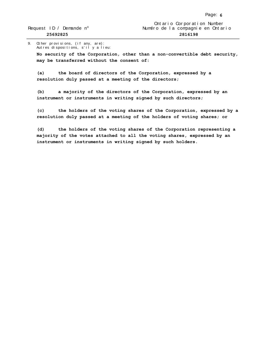 Page: Ontario Corporation Number Request ID / Demande no Numéro de la compagnie en Ontario 8. The issue, transfer or ownership of shares is/is not restricted and the restrictions (if any) are as follows: L’émission, le transfert ou la propriété d’actions est/n’est pas restreinte. Les restrictions, s’il y a lieu, sont les suivantes: 5 25692825 2816198 No share of the Corporation may be transferred unless its transfer complies with the restriction on the transfer of securities set out in paragraph 9 (Other Provisions) hereof.