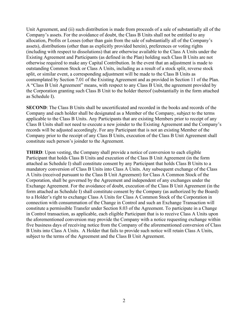 2 Unit Agreement, and (ii) such distribution is made from proceeds of a sale of substantially all of the Company’s assets. For the avoidance of doubt, the Class B Units shall not be entitled to any allocation, Profits or Losses (other than gain from the sale of substantially all of the Company’s assets), distributions (other than as explicitly provided herein), preferences or voting rights (including with respect to dissolutions) that are otherwise available to the Class A Units under the Existing Agreement and Participants (as defined in the Plan) holding such Class B Units are not otherwise required to make any Capital Contribution. In the event that an adjustment is made to outstanding Common Stock or Class A Units, including as a result of a stock split, reverse stock split, or similar event, a corresponding adjustment will be made to the Class B Units as contemplated by Section 7.01 of the Existing Agreement and as provided in Section 11 of the Plan. A “Class B Unit Agreement” means, with respect to any Class B Unit, the agreement provided by the Corporation granting such Class B Unit to the holder thereof (substantially in the form attached as Schedule I). SECOND: The Class B Units shall be uncertificated and recorded in the books and records of the Company and each holder shall be designated as a Member of the Company, subject to the terms applicable to the Class B Units. Any Participants that are existing Members prior to receipt of any Class B Units shall not need to execute a new joinder to the Existing Agreement and the Company’s records will be adjusted accordingly. For any Participant that is not an existing Member of the Company prior to the receipt of any Class B Units, execution of the Class B Unit Agreement shall constitute such person’s joinder to the Agreement. THIRD: Upon vesting, the Company shall provide a notice of conversion to each eligible Participant that holds Class B Units and execution of the Class B Unit Agreement (in the form attached as Schedule I) shall constitute consent by any Participant that holds Class B Units to a mandatory conversion of Class B Units into Class A Units. Any subsequent exchange of the Class A Units (received pursuant to the Class B Unit Agreement) for Class A Common Stock of the Corporation, shall be governed by the Agreement and independent of any exchanges under the Exchange Agreement. For the avoidance of doubt, execution of the Class B Unit Agreement (in the form attached as Schedule I) shall constitute consent by the Company (as authorized by the Board) to a Holder’s right to exchange Class A Units for Class A Common Stock of the Corporation in connection with consummation of the Change in Control and such an Exchange Transaction will constitute a permissible Transfer under Section 8.03 of the Agreement. To participate in a Change in Control transaction, as applicable, each eligible Participant that is to receive Class A Units upon the aforementioned conversion may provide the Company with a notice requesting exchange within five business days of receiving notice from the Company of the aforementioned conversion of Class B Units into Class A Units. A Holder that fails to provide such notice will retain Class A Units, subject to the terms of the Agreement and the Class B Unit Agreement.