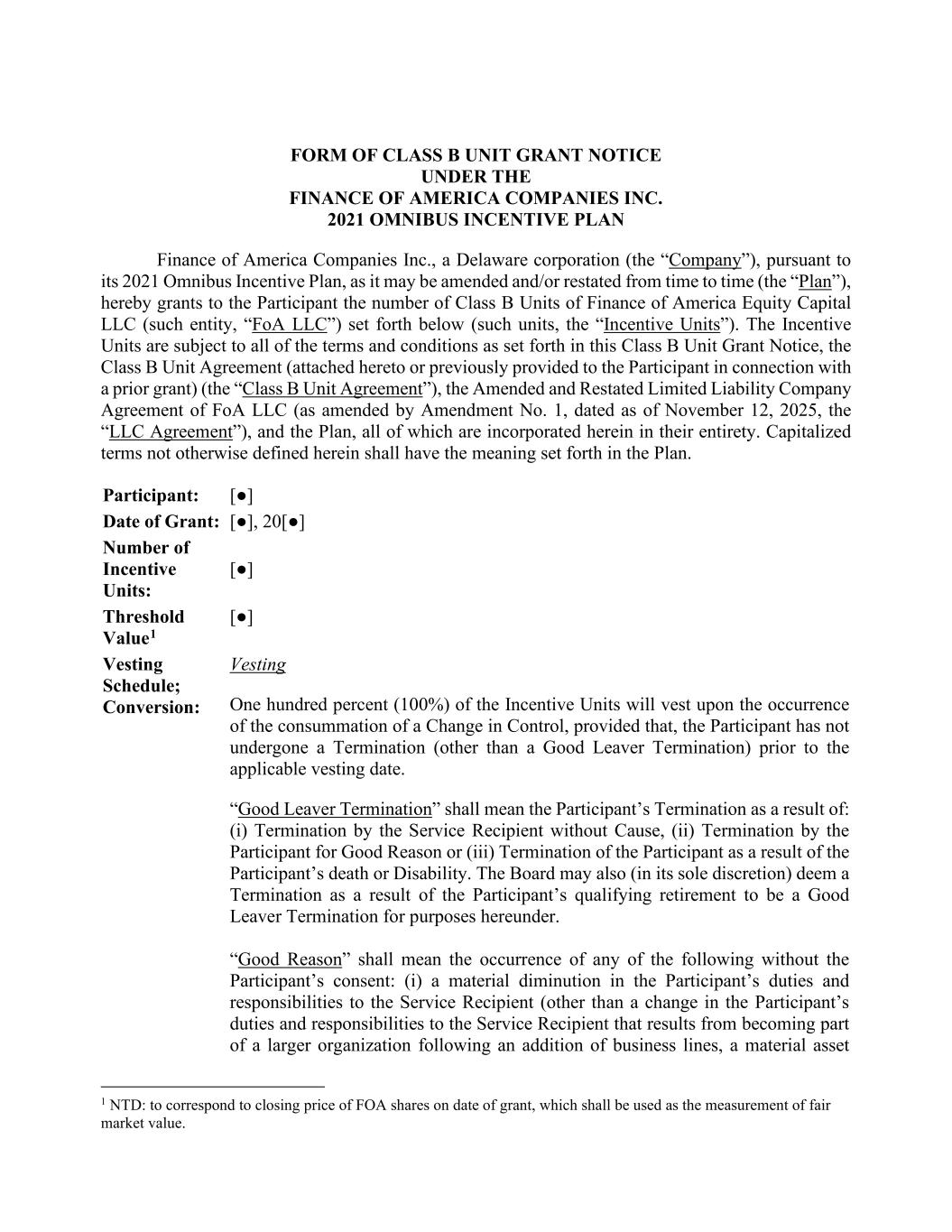 FORM OF CLASS B UNIT GRANT NOTICE UNDER THE FINANCE OF AMERICA COMPANIES INC. 2021 OMNIBUS INCENTIVE PLAN Finance of America Companies Inc., a Delaware corporation (the “Company”), pursuant to its 2021 Omnibus Incentive Plan, as it may be amended and/or restated from time to time (the “Plan”), hereby grants to the Participant the number of Class B Units of Finance of America Equity Capital LLC (such entity, “FoA LLC”) set forth below (such units, the “Incentive Units”). The Incentive Units are subject to all of the terms and conditions as set forth in this Class B Unit Grant Notice, the Class B Unit Agreement (attached hereto or previously provided to the Participant in connection with a prior grant) (the “Class B Unit Agreement”), the Amended and Restated Limited Liability Company Agreement of FoA LLC (as amended by Amendment No. 1, dated as of November 12, 2025, the “LLC Agreement”), and the Plan, all of which are incorporated herein in their entirety. Capitalized terms not otherwise defined herein shall have the meaning set forth in the Plan. Participant: [●] Date of Grant: [●], 20[●] Number of Incentive Units: [●] Threshold Value1 [●] Vesting Schedule; Conversion: Vesting One hundred percent (100%) of the Incentive Units will vest upon the occurrence of the consummation of a Change in Control, provided that, the Participant has not undergone a Termination (other than a Good Leaver Termination) prior to the applicable vesting date. “Good Leaver Termination” shall mean the Participant’s Termination as a result of: (i) Termination by the Service Recipient without Cause, (ii) Termination by the Participant for Good Reason or (iii) Termination of the Participant as a result of the Participant’s death or Disability. The Board may also (in its sole discretion) deem a Termination as a result of the Participant’s qualifying retirement to be a Good Leaver Termination for purposes hereunder. “Good Reason” shall mean the occurrence of any of the following without the Participant’s consent: (i) a material diminution in the Participant’s duties and responsibilities to the Service Recipient (other than a change in the Participant’s duties and responsibilities to the Service Recipient that results from becoming part of a larger organization following an addition of business lines, a material asset 1 NTD: to correspond to closing price of FOA shares on date of grant, which shall be used as the measurement of fair market value.
