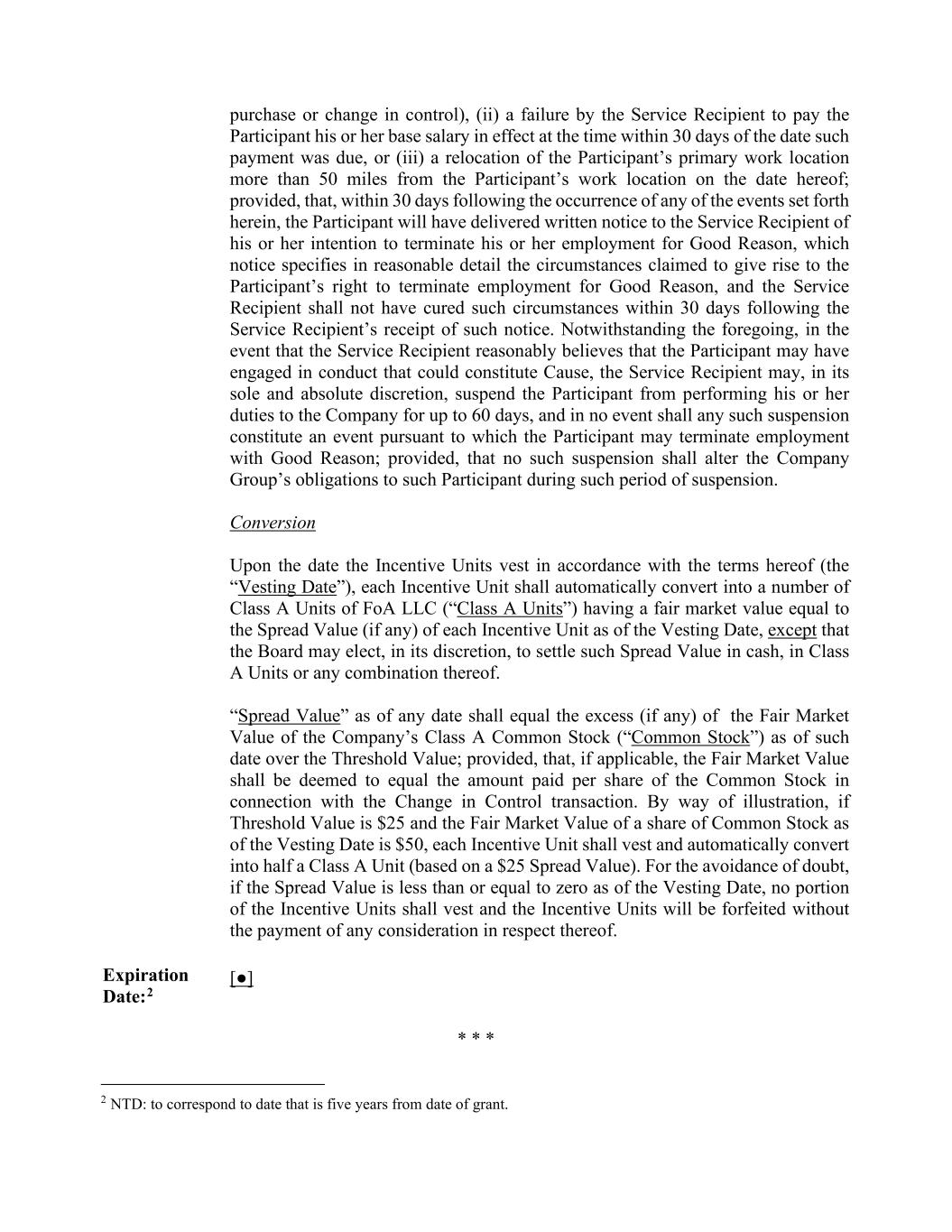 purchase or change in control), (ii) a failure by the Service Recipient to pay the Participant his or her base salary in effect at the time within 30 days of the date such payment was due, or (iii) a relocation of the Participant’s primary work location more than 50 miles from the Participant’s work location on the date hereof; provided, that, within 30 days following the occurrence of any of the events set forth herein, the Participant will have delivered written notice to the Service Recipient of his or her intention to terminate his or her employment for Good Reason, which notice specifies in reasonable detail the circumstances claimed to give rise to the Participant’s right to terminate employment for Good Reason, and the Service Recipient shall not have cured such circumstances within 30 days following the Service Recipient’s receipt of such notice. Notwithstanding the foregoing, in the event that the Service Recipient reasonably believes that the Participant may have engaged in conduct that could constitute Cause, the Service Recipient may, in its sole and absolute discretion, suspend the Participant from performing his or her duties to the Company for up to 60 days, and in no event shall any such suspension constitute an event pursuant to which the Participant may terminate employment with Good Reason; provided, that no such suspension shall alter the Company Group’s obligations to such Participant during such period of suspension. Conversion Upon the date the Incentive Units vest in accordance with the terms hereof (the “Vesting Date”), each Incentive Unit shall automatically convert into a number of Class A Units of FoA LLC (“Class A Units”) having a fair market value equal to the Spread Value (if any) of each Incentive Unit as of the Vesting Date, except that the Board may elect, in its discretion, to settle such Spread Value in cash, in Class A Units or any combination thereof. “Spread Value” as of any date shall equal the excess (if any) of the Fair Market Value of the Company’s Class A Common Stock (“Common Stock”) as of such date over the Threshold Value; provided, that, if applicable, the Fair Market Value shall be deemed to equal the amount paid per share of the Common Stock in connection with the Change in Control transaction. By way of illustration, if Threshold Value is $25 and the Fair Market Value of a share of Common Stock as of the Vesting Date is $50, each Incentive Unit shall vest and automatically convert into half a Class A Unit (based on a $25 Spread Value). For the avoidance of doubt, if the Spread Value is less than or equal to zero as of the Vesting Date, no portion of the Incentive Units shall vest and the Incentive Units will be forfeited without the payment of any consideration in respect thereof. Expiration Date:2 [●] * * * 2 NTD: to correspond to date that is five years from date of grant.