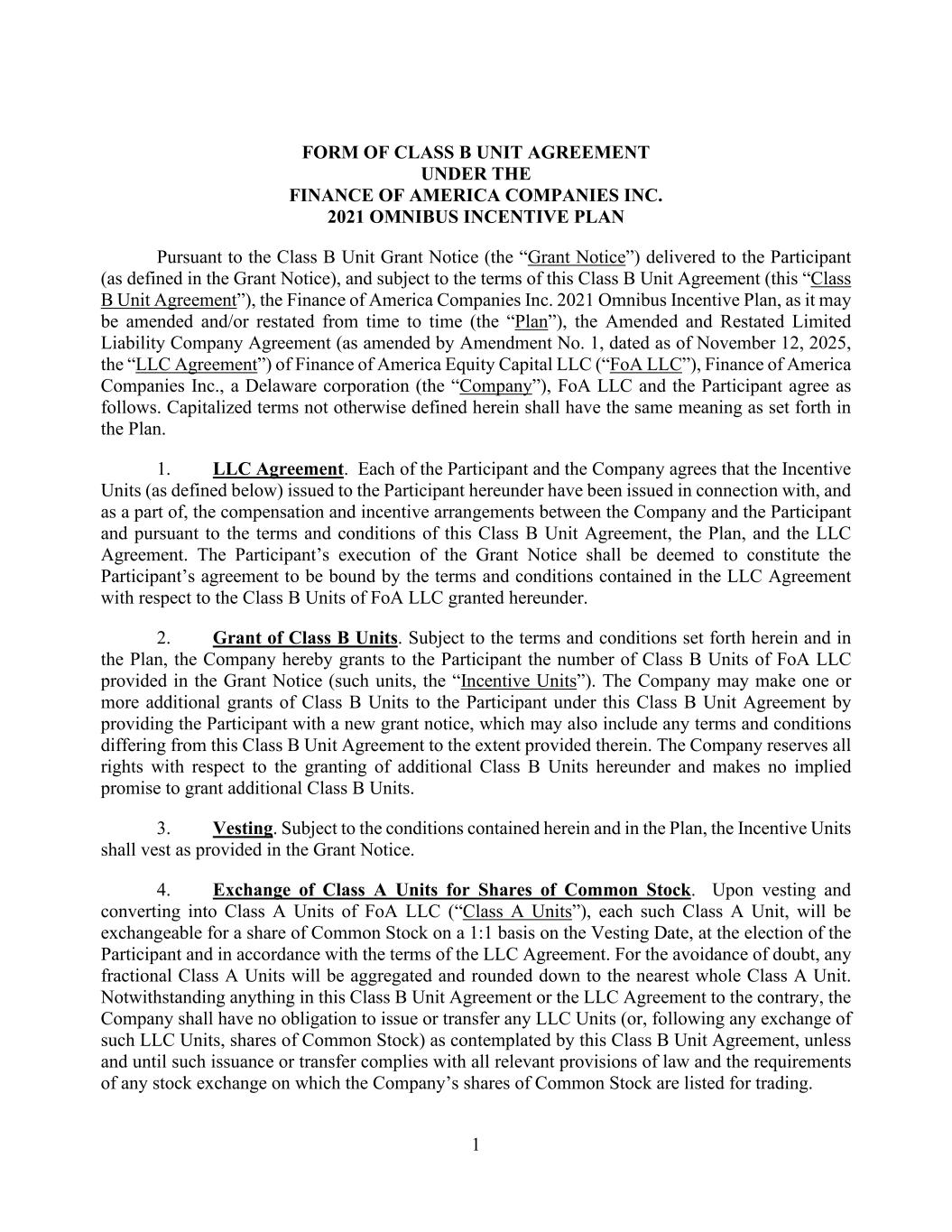 1 FORM OF CLASS B UNIT AGREEMENT UNDER THE FINANCE OF AMERICA COMPANIES INC. 2021 OMNIBUS INCENTIVE PLAN Pursuant to the Class B Unit Grant Notice (the “Grant Notice”) delivered to the Participant (as defined in the Grant Notice), and subject to the terms of this Class B Unit Agreement (this “Class B Unit Agreement”), the Finance of America Companies Inc. 2021 Omnibus Incentive Plan, as it may be amended and/or restated from time to time (the “Plan”), the Amended and Restated Limited Liability Company Agreement (as amended by Amendment No. 1, dated as of November 12, 2025, the “LLC Agreement”) of Finance of America Equity Capital LLC (“FoA LLC”), Finance of America Companies Inc., a Delaware corporation (the “Company”), FoA LLC and the Participant agree as follows. Capitalized terms not otherwise defined herein shall have the same meaning as set forth in the Plan. 1. LLC Agreement. Each of the Participant and the Company agrees that the Incentive Units (as defined below) issued to the Participant hereunder have been issued in connection with, and as a part of, the compensation and incentive arrangements between the Company and the Participant and pursuant to the terms and conditions of this Class B Unit Agreement, the Plan, and the LLC Agreement. The Participant’s execution of the Grant Notice shall be deemed to constitute the Participant’s agreement to be bound by the terms and conditions contained in the LLC Agreement with respect to the Class B Units of FoA LLC granted hereunder. 2. Grant of Class B Units. Subject to the terms and conditions set forth herein and in the Plan, the Company hereby grants to the Participant the number of Class B Units of FoA LLC provided in the Grant Notice (such units, the “Incentive Units”). The Company may make one or more additional grants of Class B Units to the Participant under this Class B Unit Agreement by providing the Participant with a new grant notice, which may also include any terms and conditions differing from this Class B Unit Agreement to the extent provided therein. The Company reserves all rights with respect to the granting of additional Class B Units hereunder and makes no implied promise to grant additional Class B Units. 3. Vesting. Subject to the conditions contained herein and in the Plan, the Incentive Units shall vest as provided in the Grant Notice. 4. Exchange of Class A Units for Shares of Common Stock. Upon vesting and converting into Class A Units of FoA LLC (“Class A Units”), each such Class A Unit, will be exchangeable for a share of Common Stock on a 1:1 basis on the Vesting Date, at the election of the Participant and in accordance with the terms of the LLC Agreement. For the avoidance of doubt, any fractional Class A Units will be aggregated and rounded down to the nearest whole Class A Unit. Notwithstanding anything in this Class B Unit Agreement or the LLC Agreement to the contrary, the Company shall have no obligation to issue or transfer any LLC Units (or, following any exchange of such LLC Units, shares of Common Stock) as contemplated by this Class B Unit Agreement, unless and until such issuance or transfer complies with all relevant provisions of law and the requirements of any stock exchange on which the Company’s shares of Common Stock are listed for trading.