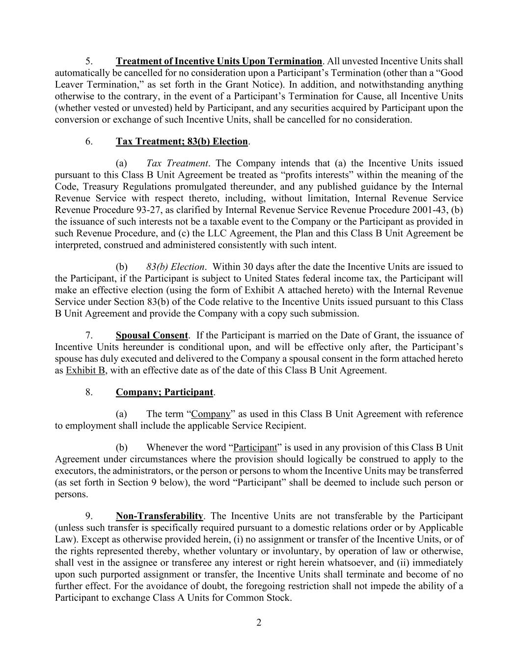 2 5. Treatment of Incentive Units Upon Termination. All unvested Incentive Units shall automatically be cancelled for no consideration upon a Participant’s Termination (other than a “Good Leaver Termination,” as set forth in the Grant Notice). In addition, and notwithstanding anything otherwise to the contrary, in the event of a Participant’s Termination for Cause, all Incentive Units (whether vested or unvested) held by Participant, and any securities acquired by Participant upon the conversion or exchange of such Incentive Units, shall be cancelled for no consideration. 6. Tax Treatment; 83(b) Election. (a) Tax Treatment. The Company intends that (a) the Incentive Units issued pursuant to this Class B Unit Agreement be treated as “profits interests” within the meaning of the Code, Treasury Regulations promulgated thereunder, and any published guidance by the Internal Revenue Service with respect thereto, including, without limitation, Internal Revenue Service Revenue Procedure 93-27, as clarified by Internal Revenue Service Revenue Procedure 2001-43, (b) the issuance of such interests not be a taxable event to the Company or the Participant as provided in such Revenue Procedure, and (c) the LLC Agreement, the Plan and this Class B Unit Agreement be interpreted, construed and administered consistently with such intent. (b) 83(b) Election. Within 30 days after the date the Incentive Units are issued to the Participant, if the Participant is subject to United States federal income tax, the Participant will make an effective election (using the form of Exhibit A attached hereto) with the Internal Revenue Service under Section 83(b) of the Code relative to the Incentive Units issued pursuant to this Class B Unit Agreement and provide the Company with a copy such submission. 7. Spousal Consent. If the Participant is married on the Date of Grant, the issuance of Incentive Units hereunder is conditional upon, and will be effective only after, the Participant’s spouse has duly executed and delivered to the Company a spousal consent in the form attached hereto as Exhibit B, with an effective date as of the date of this Class B Unit Agreement. 8. Company; Participant. (a) The term “Company” as used in this Class B Unit Agreement with reference to employment shall include the applicable Service Recipient. (b) Whenever the word “Participant” is used in any provision of this Class B Unit Agreement under circumstances where the provision should logically be construed to apply to the executors, the administrators, or the person or persons to whom the Incentive Units may be transferred (as set forth in Section 9 below), the word “Participant” shall be deemed to include such person or persons. 9. Non-Transferability. The Incentive Units are not transferable by the Participant (unless such transfer is specifically required pursuant to a domestic relations order or by Applicable Law). Except as otherwise provided herein, (i) no assignment or transfer of the Incentive Units, or of the rights represented thereby, whether voluntary or involuntary, by operation of law or otherwise, shall vest in the assignee or transferee any interest or right herein whatsoever, and (ii) immediately upon such purported assignment or transfer, the Incentive Units shall terminate and become of no further effect. For the avoidance of doubt, the foregoing restriction shall not impede the ability of a Participant to exchange Class A Units for Common Stock.