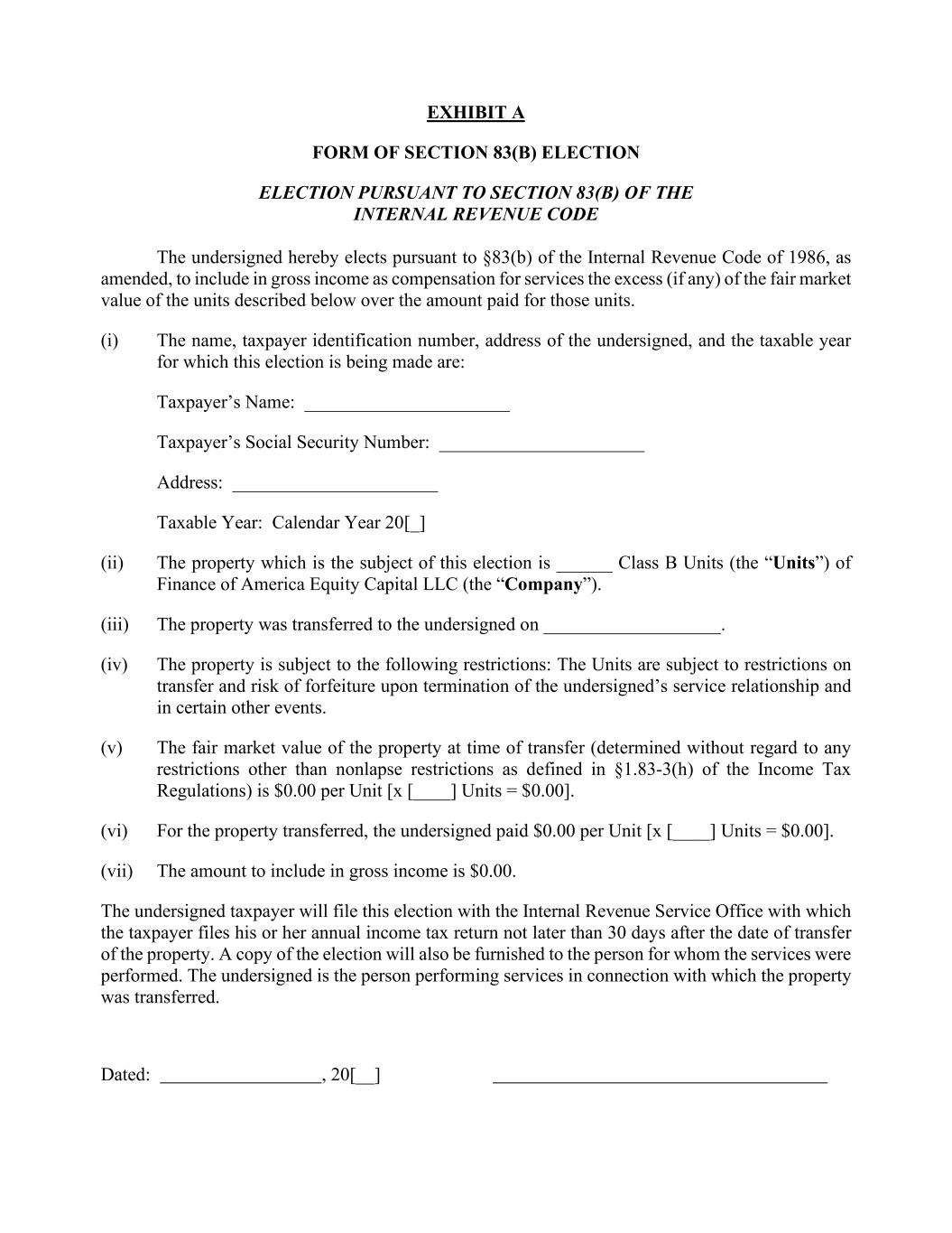 EXHIBIT A FORM OF SECTION 83(B) ELECTION ELECTION PURSUANT TO SECTION 83(B) OF THE INTERNAL REVENUE CODE The undersigned hereby elects pursuant to §83(b) of the Internal Revenue Code of 1986, as amended, to include in gross income as compensation for services the excess (if any) of the fair market value of the units described below over the amount paid for those units. (i) The name, taxpayer identification number, address of the undersigned, and the taxable year for which this election is being made are: Taxpayer’s Name: ______________________ Taxpayer’s Social Security Number: ______________________ Address: ______________________ Taxable Year: Calendar Year 20[_] (ii) The property which is the subject of this election is ______ Class B Units (the “Units”) of Finance of America Equity Capital LLC (the “Company”). (iii) The property was transferred to the undersigned on ___________________. (iv) The property is subject to the following restrictions: The Units are subject to restrictions on transfer and risk of forfeiture upon termination of the undersigned’s service relationship and in certain other events. (v) The fair market value of the property at time of transfer (determined without regard to any restrictions other than nonlapse restrictions as defined in §1.83-3(h) of the Income Tax Regulations) is $0.00 per Unit [x [____] Units = $0.00]. (vi) For the property transferred, the undersigned paid $0.00 per Unit [x [____] Units = $0.00]. (vii) The amount to include in gross income is $0.00. The undersigned taxpayer will file this election with the Internal Revenue Service Office with which the taxpayer files his or her annual income tax return not later than 30 days after the date of transfer of the property. A copy of the election will also be furnished to the person for whom the services were performed. The undersigned is the person performing services in connection with which the property was transferred. Dated: , 20[__]