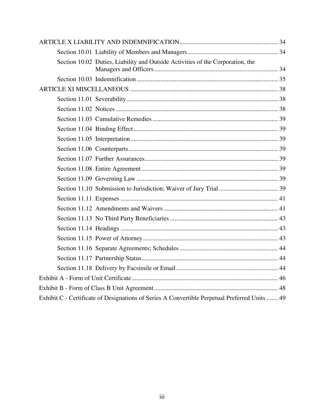 iii ARTICLE X LIABILITY AND INDEMNIFICATION .............................................................. 34 Section 10.01 Liability of Members and Managers ......................................................... 34 Section 10.02 Duties, Liability and Outside Activities of the Corporation, the Managers and Officers .............................................................................. 34 Section 10.03 Indemnification ......................................................................................... 35 ARTICLE XI MISCELLANEOUS ............................................................................................. 38 Section 11.01 Severability ............................................................................................... 38 Section 11.02 Notices ...................................................................................................... 38 Section 11.03 Cumulative Remedies ............................................................................... 39 Section 11.04 Binding Effect ........................................................................................... 39 Section 11.05 Interpretation ............................................................................................. 39 Section 11.06 Counterparts .............................................................................................. 39 Section 11.07 Further Assurances.................................................................................... 39 Section 11.08 Entire Agreement ...................................................................................... 39 Section 11.09 Governing Law ......................................................................................... 39 Section 11.10 Submission to Jurisdiction; Waiver of Jury Trial ..................................... 39 Section 11.11 Expenses ................................................................................................... 41 Section 11.12 Amendments and Waivers ........................................................................ 41 Section 11.13 No Third Party Beneficiaries .................................................................... 43 Section 11.14 Headings ................................................................................................... 43 Section 11.15 Power of Attorney ..................................................................................... 43 Section 11.16 Separate Agreements; Schedules .............................................................. 44 Section 11.17 Partnership Status...................................................................................... 44 Section 11.18 Delivery by Facsimile or Email ................................................................ 44 Exhibit A - Form of Unit Certificate ............................................................................................ 46 Exhibit B - Form of Class B Unit Agreement .............................................................................. 48 Exhibit C - Certificate of Designations of Series A Convertible Perpetual Preferred Units ....... 49