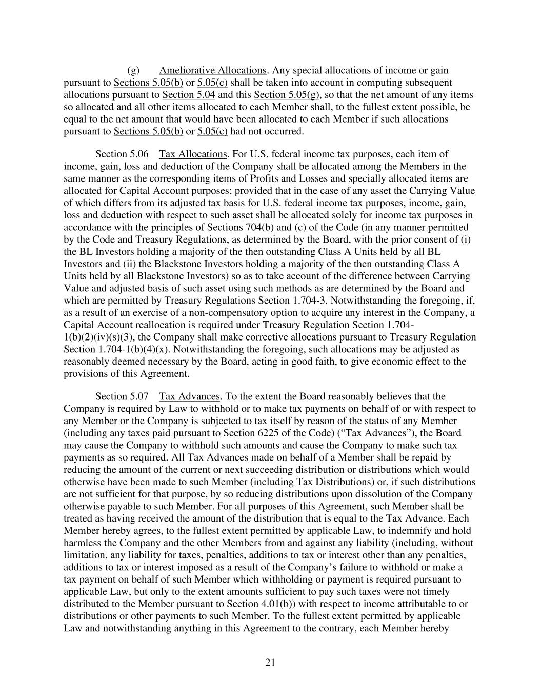21 (g) Ameliorative Allocations. Any special allocations of income or gain pursuant to Sections 5.05(b) or 5.05(c) shall be taken into account in computing subsequent allocations pursuant to Section 5.04 and this Section 5.05(g), so that the net amount of any items so allocated and all other items allocated to each Member shall, to the fullest extent possible, be equal to the net amount that would have been allocated to each Member if such allocations pursuant to Sections 5.05(b) or 5.05(c) had not occurred. Section 5.06 Tax Allocations. For U.S. federal income tax purposes, each item of income, gain, loss and deduction of the Company shall be allocated among the Members in the same manner as the corresponding items of Profits and Losses and specially allocated items are allocated for Capital Account purposes; provided that in the case of any asset the Carrying Value of which differs from its adjusted tax basis for U.S. federal income tax purposes, income, gain, loss and deduction with respect to such asset shall be allocated solely for income tax purposes in accordance with the principles of Sections 704(b) and (c) of the Code (in any manner permitted by the Code and Treasury Regulations, as determined by the Board, with the prior consent of (i) the BL Investors holding a majority of the then outstanding Class A Units held by all BL Investors and (ii) the Blackstone Investors holding a majority of the then outstanding Class A Units held by all Blackstone Investors) so as to take account of the difference between Carrying Value and adjusted basis of such asset using such methods as are determined by the Board and which are permitted by Treasury Regulations Section 1.704-3. Notwithstanding the foregoing, if, as a result of an exercise of a non-compensatory option to acquire any interest in the Company, a Capital Account reallocation is required under Treasury Regulation Section 1.704- 1(b)(2)(iv)(s)(3), the Company shall make corrective allocations pursuant to Treasury Regulation Section 1.704-1(b)(4)(x). Notwithstanding the foregoing, such allocations may be adjusted as reasonably deemed necessary by the Board, acting in good faith, to give economic effect to the provisions of this Agreement. Section 5.07 Tax Advances. To the extent the Board reasonably believes that the Company is required by Law to withhold or to make tax payments on behalf of or with respect to any Member or the Company is subjected to tax itself by reason of the status of any Member (including any taxes paid pursuant to Section 6225 of the Code) (“Tax Advances”), the Board may cause the Company to withhold such amounts and cause the Company to make such tax payments as so required. All Tax Advances made on behalf of a Member shall be repaid by reducing the amount of the current or next succeeding distribution or distributions which would otherwise have been made to such Member (including Tax Distributions) or, if such distributions are not sufficient for that purpose, by so reducing distributions upon dissolution of the Company otherwise payable to such Member. For all purposes of this Agreement, such Member shall be treated as having received the amount of the distribution that is equal to the Tax Advance. Each Member hereby agrees, to the fullest extent permitted by applicable Law, to indemnify and hold harmless the Company and the other Members from and against any liability (including, without limitation, any liability for taxes, penalties, additions to tax or interest other than any penalties, additions to tax or interest imposed as a result of the Company’s failure to withhold or make a tax payment on behalf of such Member which withholding or payment is required pursuant to applicable Law, but only to the extent amounts sufficient to pay such taxes were not timely distributed to the Member pursuant to Section 4.01(b)) with respect to income attributable to or distributions or other payments to such Member. To the fullest extent permitted by applicable Law and notwithstanding anything in this Agreement to the contrary, each Member hereby