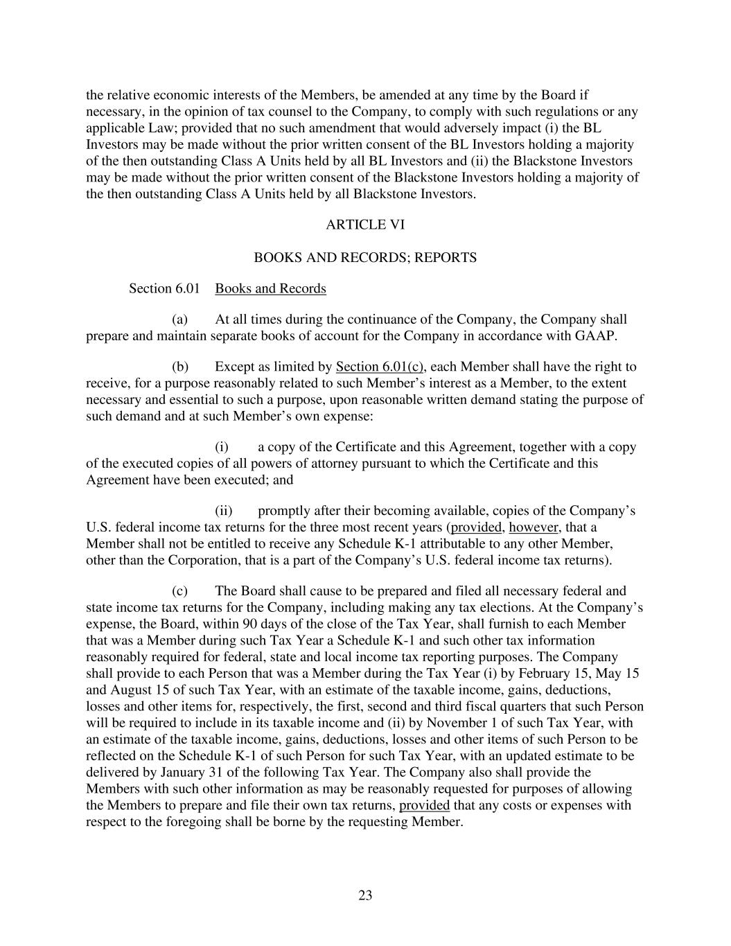 23 the relative economic interests of the Members, be amended at any time by the Board if necessary, in the opinion of tax counsel to the Company, to comply with such regulations or any applicable Law; provided that no such amendment that would adversely impact (i) the BL Investors may be made without the prior written consent of the BL Investors holding a majority of the then outstanding Class A Units held by all BL Investors and (ii) the Blackstone Investors may be made without the prior written consent of the Blackstone Investors holding a majority of the then outstanding Class A Units held by all Blackstone Investors. ARTICLE VI BOOKS AND RECORDS; REPORTS Section 6.01 Books and Records (a) At all times during the continuance of the Company, the Company shall prepare and maintain separate books of account for the Company in accordance with GAAP. (b) Except as limited by Section 6.01(c), each Member shall have the right to receive, for a purpose reasonably related to such Member’s interest as a Member, to the extent necessary and essential to such a purpose, upon reasonable written demand stating the purpose of such demand and at such Member’s own expense: (i) a copy of the Certificate and this Agreement, together with a copy of the executed copies of all powers of attorney pursuant to which the Certificate and this Agreement have been executed; and (ii) promptly after their becoming available, copies of the Company’s U.S. federal income tax returns for the three most recent years (provided, however, that a Member shall not be entitled to receive any Schedule K-1 attributable to any other Member, other than the Corporation, that is a part of the Company’s U.S. federal income tax returns). (c) The Board shall cause to be prepared and filed all necessary federal and state income tax returns for the Company, including making any tax elections. At the Company’s expense, the Board, within 90 days of the close of the Tax Year, shall furnish to each Member that was a Member during such Tax Year a Schedule K-1 and such other tax information reasonably required for federal, state and local income tax reporting purposes. The Company shall provide to each Person that was a Member during the Tax Year (i) by February 15, May 15 and August 15 of such Tax Year, with an estimate of the taxable income, gains, deductions, losses and other items for, respectively, the first, second and third fiscal quarters that such Person will be required to include in its taxable income and (ii) by November 1 of such Tax Year, with an estimate of the taxable income, gains, deductions, losses and other items of such Person to be reflected on the Schedule K-1 of such Person for such Tax Year, with an updated estimate to be delivered by January 31 of the following Tax Year. The Company also shall provide the Members with such other information as may be reasonably requested for purposes of allowing the Members to prepare and file their own tax returns, provided that any costs or expenses with respect to the foregoing shall be borne by the requesting Member.