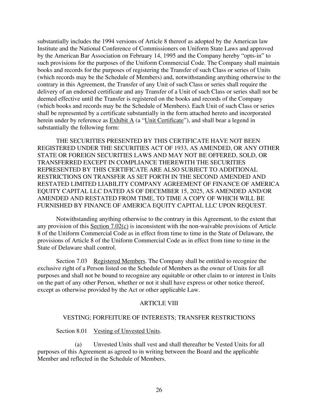 26 substantially includes the 1994 versions of Article 8 thereof as adopted by the American law Institute and the National Conference of Commissioners on Uniform State Laws and approved by the American Bar Association on February 14, 1995 and the Company hereby “opts-in” to such provisions for the purposes of the Uniform Commercial Code. The Company shall maintain books and records for the purposes of registering the Transfer of such Class or series of Units (which records may be the Schedule of Members) and, notwithstanding anything otherwise to the contrary in this Agreement, the Transfer of any Unit of such Class or series shall require the delivery of an endorsed certificate and any Transfer of a Unit of such Class or series shall not be deemed effective until the Transfer is registered on the books and records of the Company (which books and records may be the Schedule of Members). Each Unit of such Class or series shall be represented by a certificate substantially in the form attached hereto and incorporated herein under by reference as Exhibit A (a “Unit Certificate”), and shall bear a legend in substantially the following form: THE SECURITIES PRESENTED BY THIS CERTIFICATE HAVE NOT BEEN REGISTERED UNDER THE SECURITIES ACT OF 1933, AS AMENDED, OR ANY OTHER STATE OR FOREIGN SECURITIES LAWS AND MAY NOT BE OFFERED, SOLD, OR TRANSFERRED EXCEPT IN COMPLIANCE THEREWITH THE SECURITIES REPRESENTED BY THIS CERTIFICATE ARE ALSO SUBJECT TO ADDITIONAL RESTRICTIONS ON TRANSFER AS SET FORTH IN THE SECOND AMENDED AND RESTATED LIMITED LIABILITY COMPANY AGREEMENT OF FINANCE OF AMERICA EQUITY CAPITAL LLC DATED AS OF DECEMBER 15, 2025, AS AMENDED AND/OR AMENDED AND RESTATED FROM TIME, TO TIME A COPY OF WHICH WILL BE FURNISHED BY FINANCE OF AMERICA EQUITY CAPITAL LLC UPON REQUEST. Notwithstanding anything otherwise to the contrary in this Agreement, to the extent that any provision of this Section 7.02(c) is inconsistent with the non-waivable provisions of Article 8 of the Uniform Commercial Code as in effect from time to time in the State of Delaware, the provisions of Article 8 of the Uniform Commercial Code as in effect from time to time in the State of Delaware shall control. Section 7.03 Registered Members. The Company shall be entitled to recognize the exclusive right of a Person listed on the Schedule of Members as the owner of Units for all purposes and shall not be bound to recognize any equitable or other claim to or interest in Units on the part of any other Person, whether or not it shall have express or other notice thereof, except as otherwise provided by the Act or other applicable Law. ARTICLE VIII VESTING; FORFEITURE OF INTERESTS; TRANSFER RESTRICTIONS Section 8.01 Vesting of Unvested Units. (a) Unvested Units shall vest and shall thereafter be Vested Units for all purposes of this Agreement as agreed to in writing between the Board and the applicable Member and reflected in the Schedule of Members.