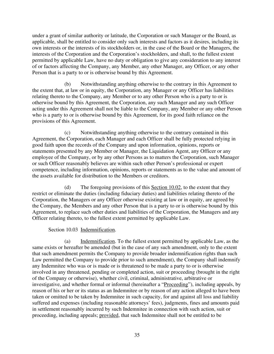 35 under a grant of similar authority or latitude, the Corporation or such Manager or the Board, as applicable, shall be entitled to consider only such interests and factors as it desires, including its own interests or the interests of its stockholders or, in the case of the Board or the Managers, the interests of the Corporation and the Corporation’s stockholders, and shall, to the fullest extent permitted by applicable Law, have no duty or obligation to give any consideration to any interest of or factors affecting the Company, any Member, any other Manager, any Officer, or any other Person that is a party to or is otherwise bound by this Agreement. (b) Notwithstanding anything otherwise to the contrary in this Agreement to the extent that, at law or in equity, the Corporation, any Manager or any Officer has liabilities relating thereto to the Company, any Member or to any other Person who is a party to or is otherwise bound by this Agreement, the Corporation, any such Manager and any such Officer acting under this Agreement shall not be liable to the Company, any Member or any other Person who is a party to or is otherwise bound by this Agreement, for its good faith reliance on the provisions of this Agreement. (c) Notwithstanding anything otherwise to the contrary contained in this Agreement, the Corporation, each Manager and each Officer shall be fully protected relying in good faith upon the records of the Company and upon information, opinions, reports or statements presented by any Member or Manager, the Liquidation Agent, any Officer or any employee of the Company, or by any other Persons as to matters the Corporation, such Manager or such Officer reasonably believes are within such other Person’s professional or expert competence, including information, opinions, reports or statements as to the value and amount of the assets available for distribution to the Members or creditors. (d) The foregoing provisions of this Section 10.02, to the extent that they restrict or eliminate the duties (including fiduciary duties) and liabilities relating thereto of the Corporation, the Managers or any Officer otherwise existing at law or in equity, are agreed by the Company, the Members and any other Person that is a party to or is otherwise bound by this Agreement, to replace such other duties and liabilities of the Corporation, the Managers and any Officer relating thereto, to the fullest extent permitted by applicable Law. Section 10.03 Indemnification. (a) Indemnification. To the fullest extent permitted by applicable Law, as the same exists or hereafter be amended (but in the case of any such amendment, only to the extent that such amendment permits the Company to provide broader indemnification rights than such Law permitted the Company to provide prior to such amendment), the Company shall indemnify any Indemnitee who was or is made or is threatened to be made a party to or is otherwise involved in any threatened, pending or completed action, suit or proceeding (brought in the right of the Company or otherwise), whether civil, criminal, administrative, arbitrative or investigative, and whether formal or informal (hereinafter a “Proceeding”), including appeals, by reason of his or her or its status as an Indemnitee or by reason of any action alleged to have been taken or omitted to be taken by Indemnitee in such capacity, for and against all loss and liability suffered and expenses (including reasonable attorneys’ fees), judgments, fines and amounts paid in settlement reasonably incurred by such Indemnitee in connection with such action, suit or proceeding, including appeals; provided, that such Indemnitee shall not be entitled to be