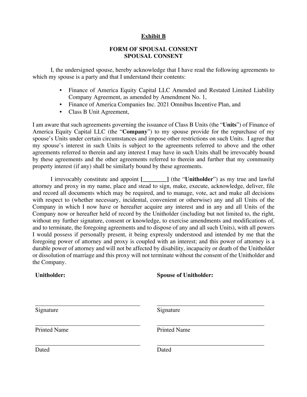 Exhibit B FORM OF SPOUSAL CONSENT SPOUSAL CONSENT I, the undersigned spouse, hereby acknowledge that I have read the following agreements to which my spouse is a party and that I understand their contents: • Finance of America Equity Capital LLC Amended and Restated Limited Liability Company Agreement, as amended by Amendment No. 1, • Finance of America Companies Inc. 2021 Omnibus Incentive Plan, and • Class B Unit Agreement, I am aware that such agreements governing the issuance of Class B Units (the “Units”) of Finance of America Equity Capital LLC (the “Company”) to my spouse provide for the repurchase of my spouse’s Units under certain circumstances and impose other restrictions on such Units. I agree that my spouse’s interest in such Units is subject to the agreements referred to above and the other agreements referred to therein and any interest I may have in such Units shall be irrevocably bound by these agreements and the other agreements referred to therein and further that my community property interest (if any) shall be similarly bound by these agreements. I irrevocably constitute and appoint [________] (the “Unitholder”) as my true and lawful attorney and proxy in my name, place and stead to sign, make, execute, acknowledge, deliver, file and record all documents which may be required, and to manage, vote, act and make all decisions with respect to (whether necessary, incidental, convenient or otherwise) any and all Units of the Company in which I now have or hereafter acquire any interest and in any and all Units of the Company now or hereafter held of record by the Unitholder (including but not limited to, the right, without my further signature, consent or knowledge, to exercise amendments and modifications of, and to terminate, the foregoing agreements and to dispose of any and all such Units), with all powers I would possess if personally present, it being expressly understood and intended by me that the foregoing power of attorney and proxy is coupled with an interest; and this power of attorney is a durable power of attorney and will not be affected by disability, incapacity or death of the Unitholder or dissolution of marriage and this proxy will not terminate without the consent of the Unitholder and the Company. Unitholder: Spouse of Unitholder: Signature Signature Printed Name Printed Name Dated Dated